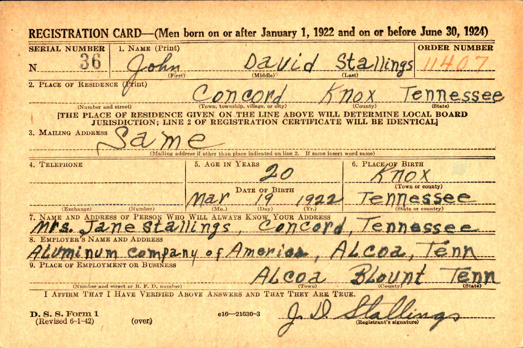 John David Stallings was the son of Love S. Stallings. He was married with Edith Jane Stallings. He enlisted on June 10, 1944 in Camp Shelby, MS