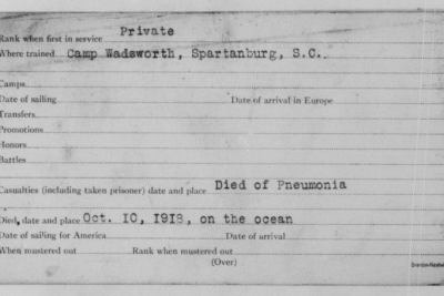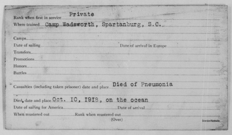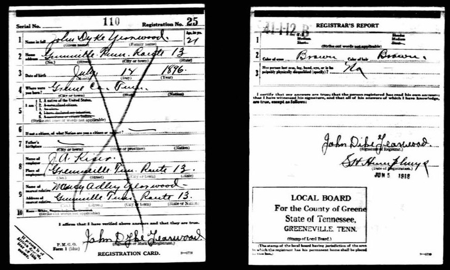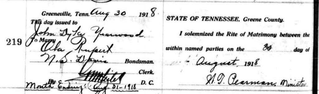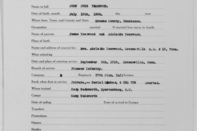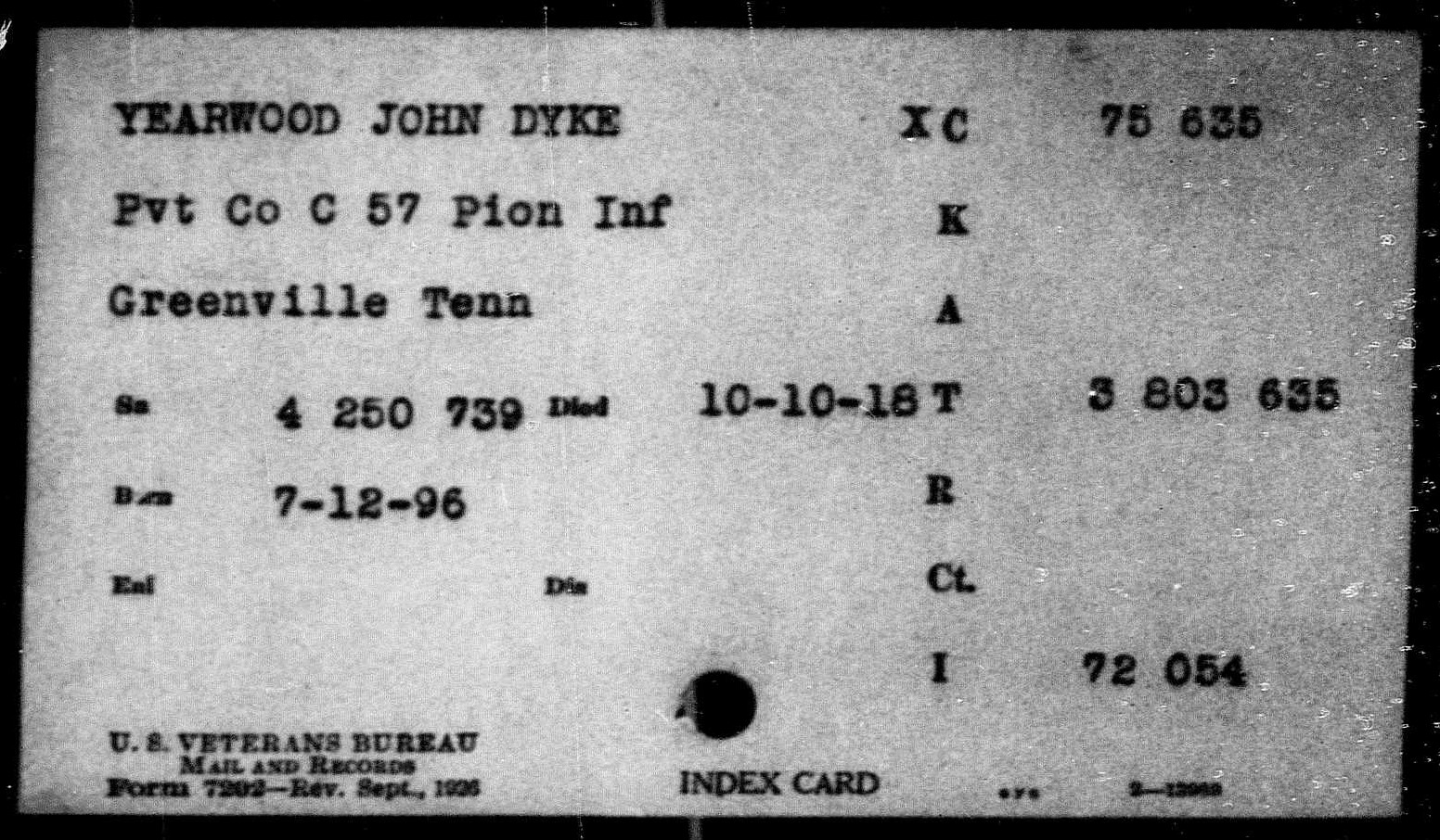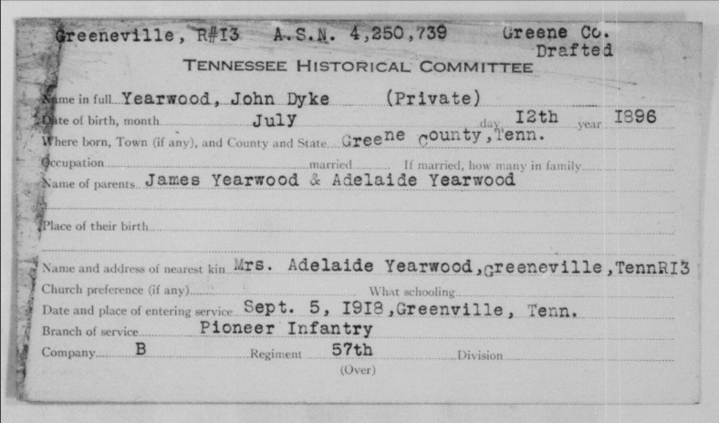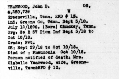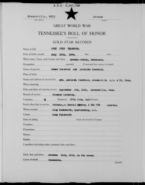 John Dyke Yearwood was born 12 July 1896 in Chuckey, Tennessee to James H. Yearwood and Nancy Adelaide Patterson. He married Ola Rupert on 30 August 1918 in Greene County. He entered the service on 5 September 1918 at Greeneville and trained at Camp Wadsworth in Spartanburg, South Carolina. He died at sea 10 October 1918 of pneumonia. He is buried at Greene County Meadow Creek Cemetery.