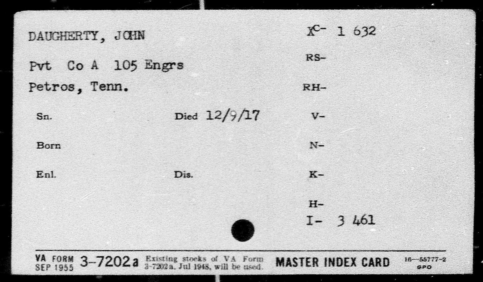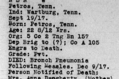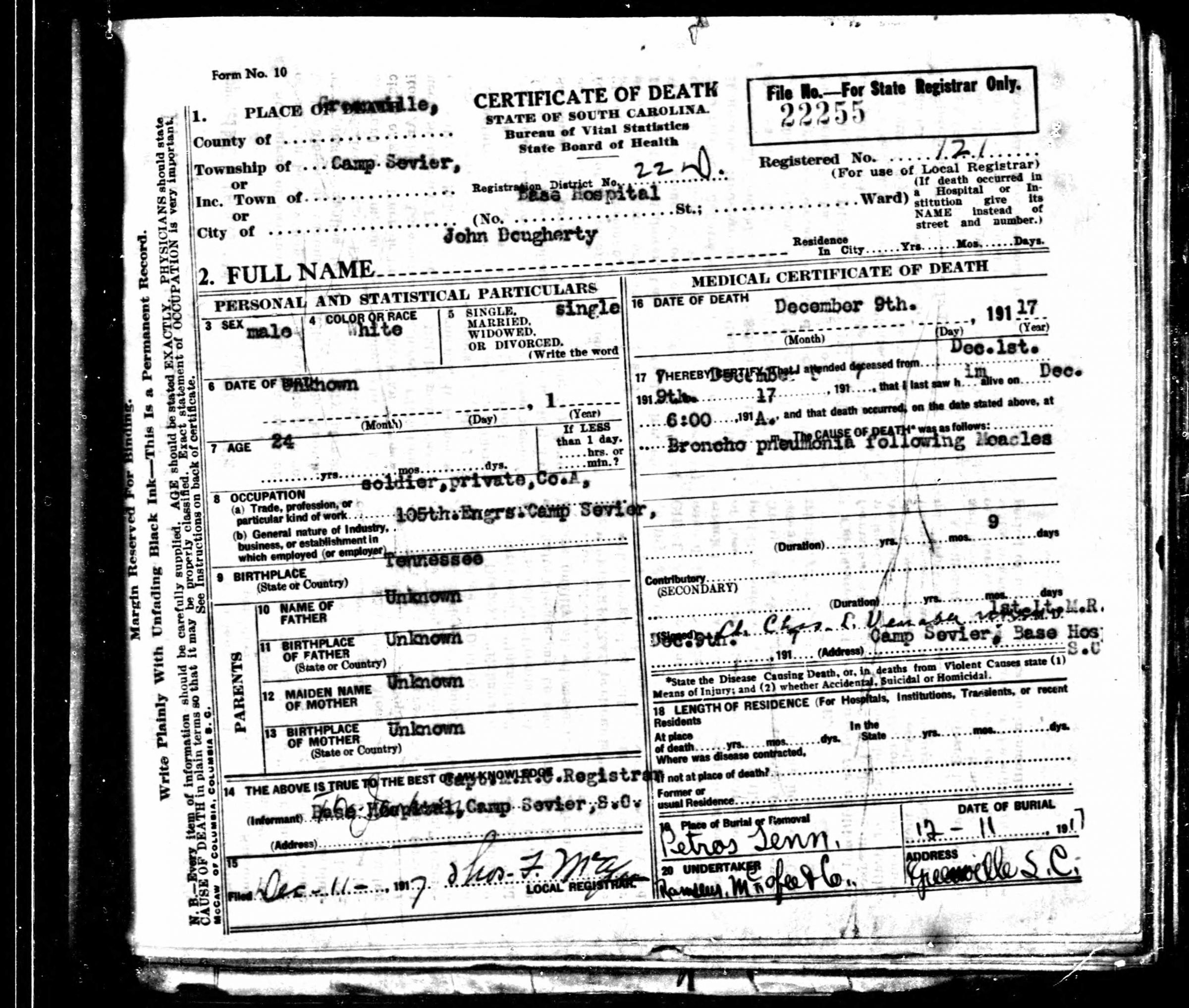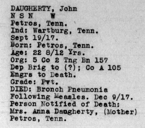 John Daughtery was born in Petros, TN. He died on December 9, 1917 of Spanish influenza at Camp Sevier, SC.