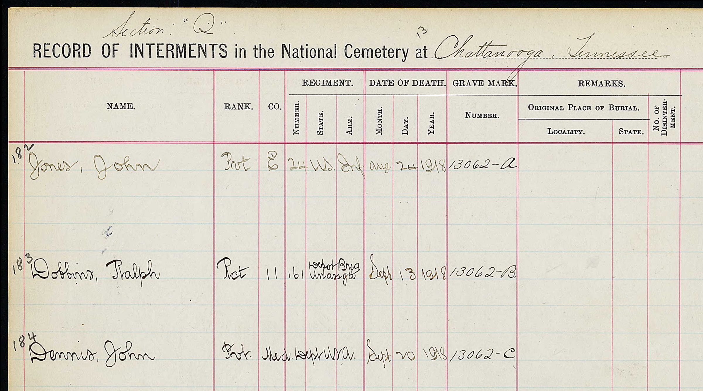 He is buried at Chattanooga National Cemetery in Chattanooga, Tennessee, 13062-C.