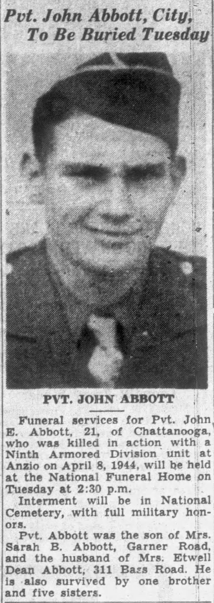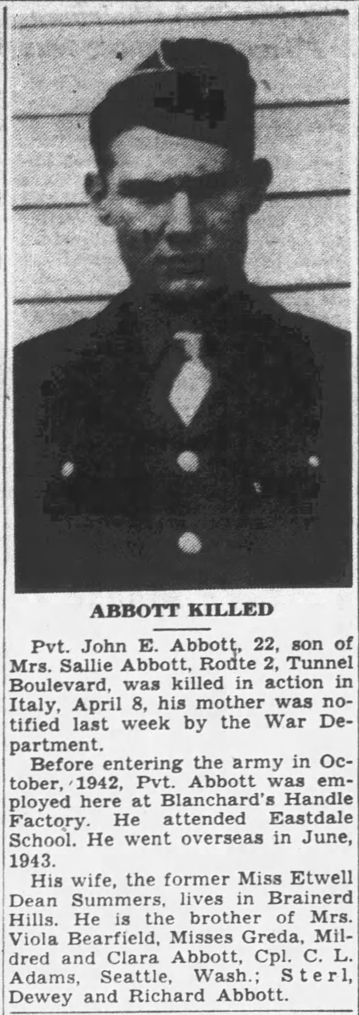 Pvt. John E. Abbott, 22, son of Mrs. Sallie Abbott, Route 2, Tunnel Boulevard, was killed in action in Italy, April 8, his mother was notified last week by the War Department. Before entering the army in October, 1942, Pvt. Abbott was employed here at Blanchard’s Handle Factory. He attended Eastdale School. He went overseas in June, 1943. His wife, the former Miss Etwell Dean Summers, lives in Brainerd Hills. He is the brother of Mrs. Viola Bearfield, Misses Greda, Mildred and Clara Abbott, Cpl. C.L. Adams, Seattle, Wash.; Sterl, Dewey and Richard Abbott.