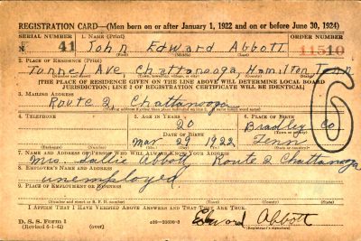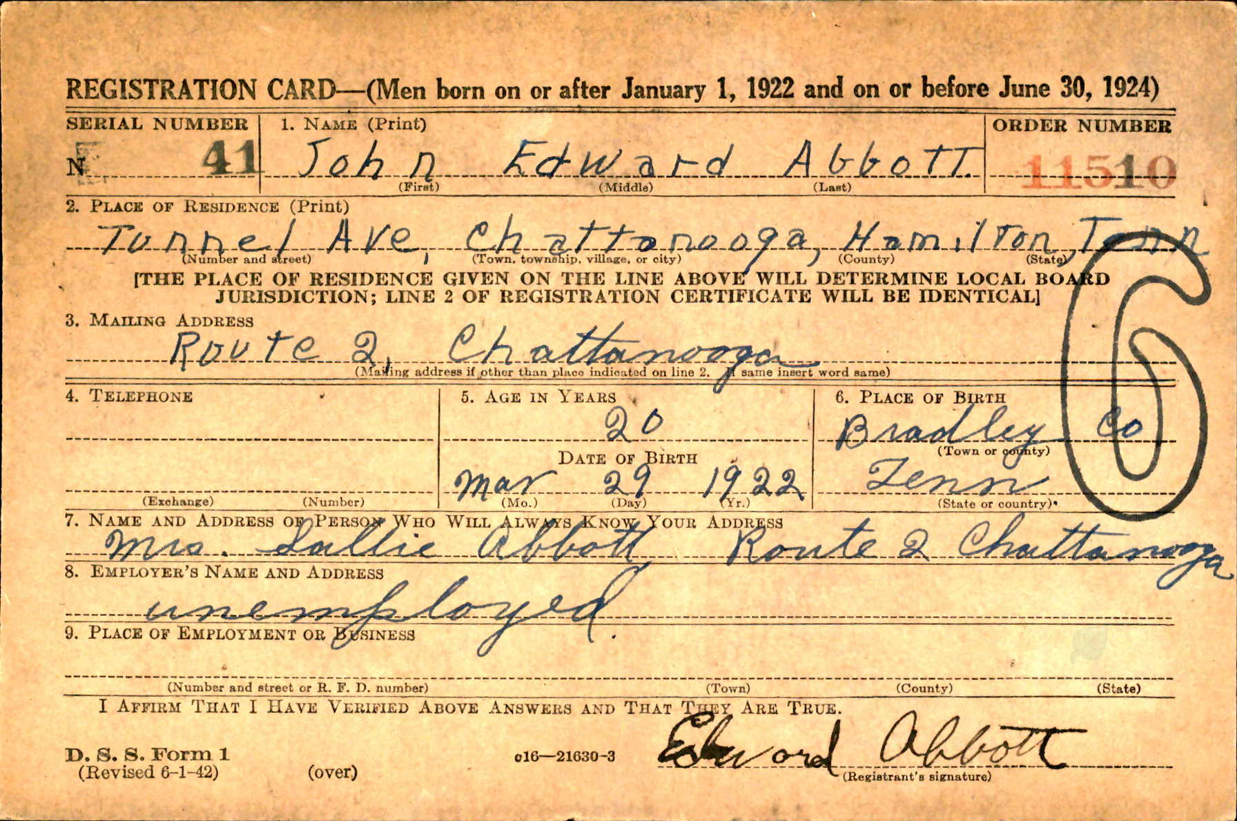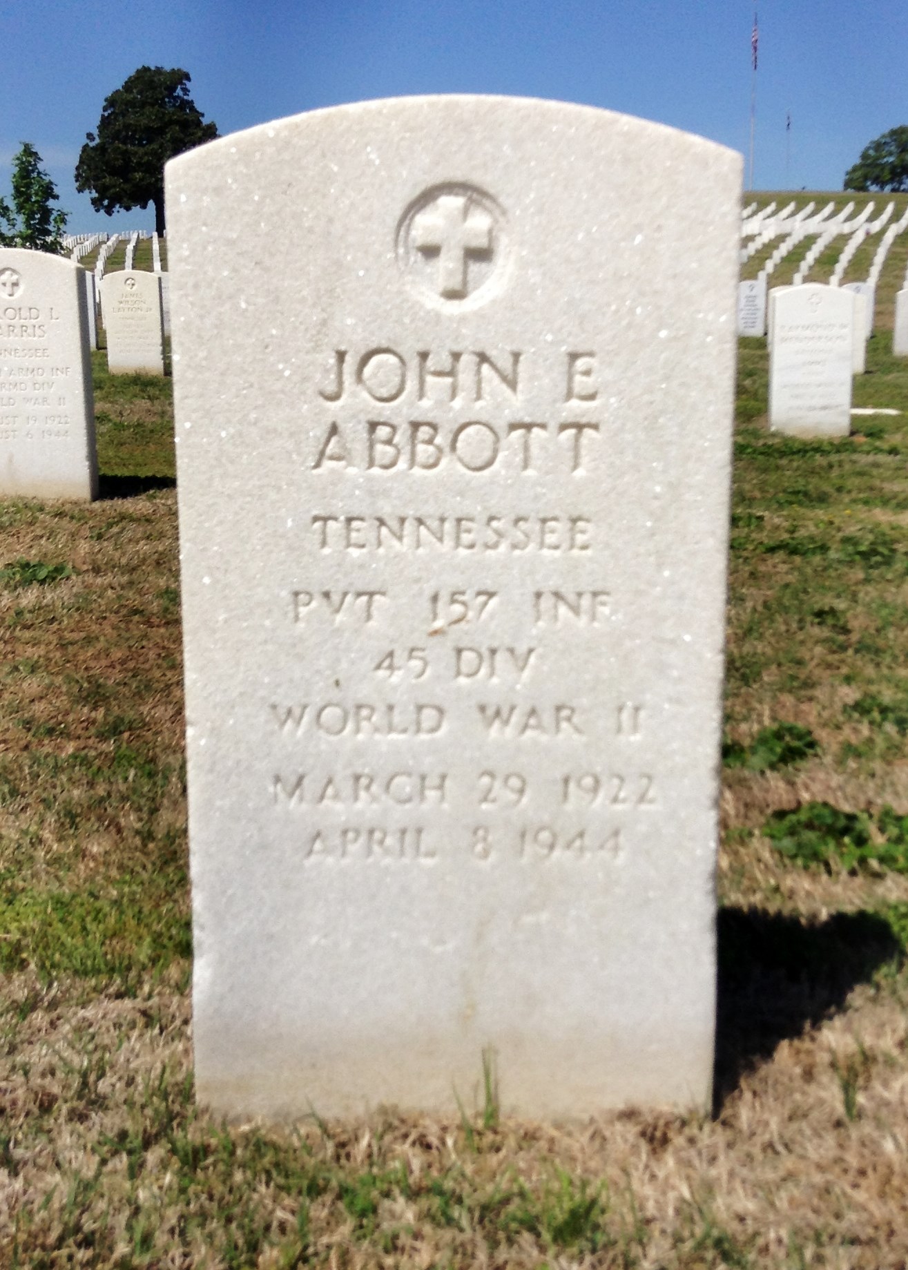 John Edward Abbott was born in Bradley County, Tennessee, the son of John C. Abbott and Sallie Wilson. He enlisted 8 Oct 1942 at Ft Oglethorpe, Georgia. He served with the 157th Infantry, 45th Division. Pvt Abbott was returned from Italy.