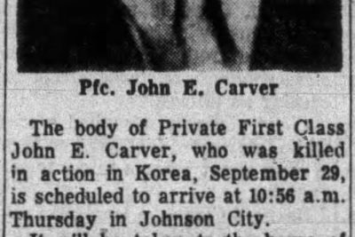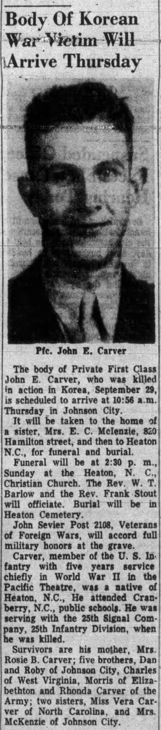 The body of Private First Class John E. Carver, who was killed in action in Korea, September 29, is scheduled to arrive Thursday in Johnson City. It will be taken to the home of a sister, Mrs. E.C. McInzie, 820 Hamilton street, and then to Heaton N.C., for funeral and burial.