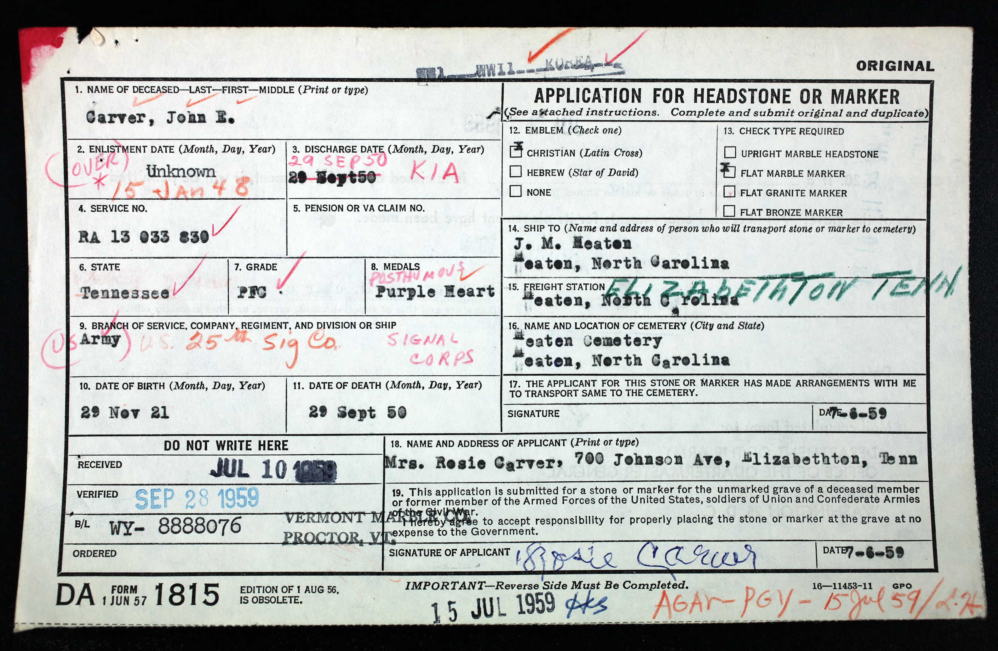 Private First Class Carver was a member of the 25th Signal Company, 25th Infantry Division. He was killed in action while fighting the enemy in South Korea.
