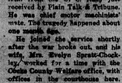 He joined the service shortly after the war broke out, and his wife, Mrs. Evelyn Spratt Chockley, worked for a time with the Obeke County Welfare office, with offices in the courthouse here.