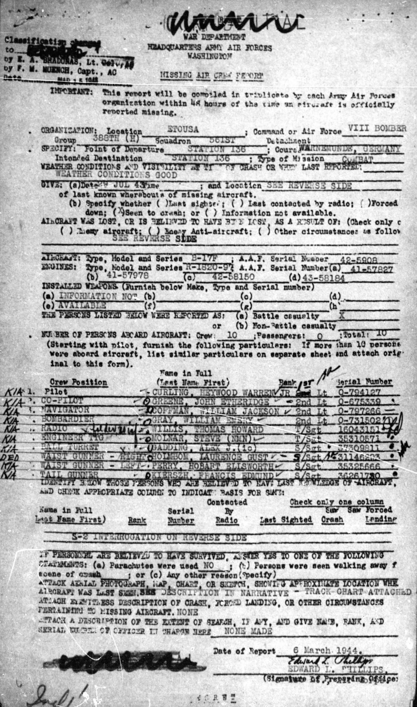 John was assigned to the 561st Bomb Squadron, 388th Bomb Group Heavy, 45th Bomb Wing, 8th Air Force as a Boeing B-17 Flying Fortress co-pilot. The 388th was activated at Gowen Field, Boise, Idaho, on 24 December 1942. Here John was assigned to his crew and plane. Aircraft Commander/Pilot 1st Lt Heywood Warren Curling Jr from Norfolk, Virginia introduced John to their ship, B-17F #42-5908, and they started training on her. They moved to Wendover Field, Utah, on 1 February 1943 and Sioux City Army Air Field, South Dakota, on 29 April. John and his crew left around 10 June 1943 for their new home in England, United States Army Air Force Station 136, Royal Air Force Station, Knettishall near Thetford, England.