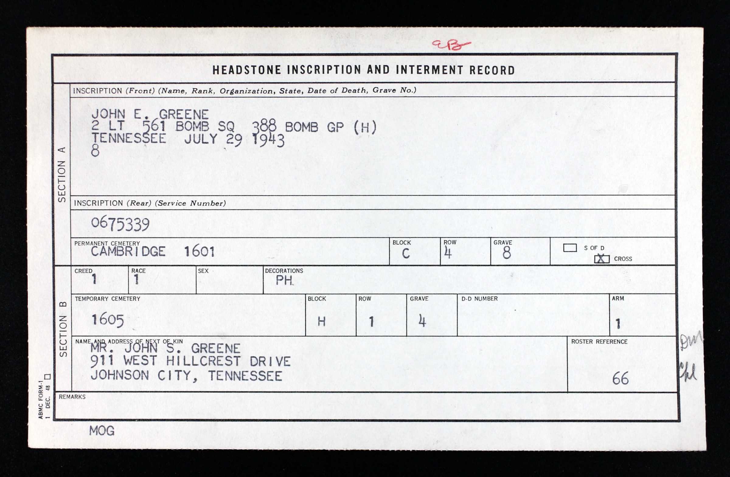 Second Lieutenant John Etheridge Greene, Service Number 0-675339