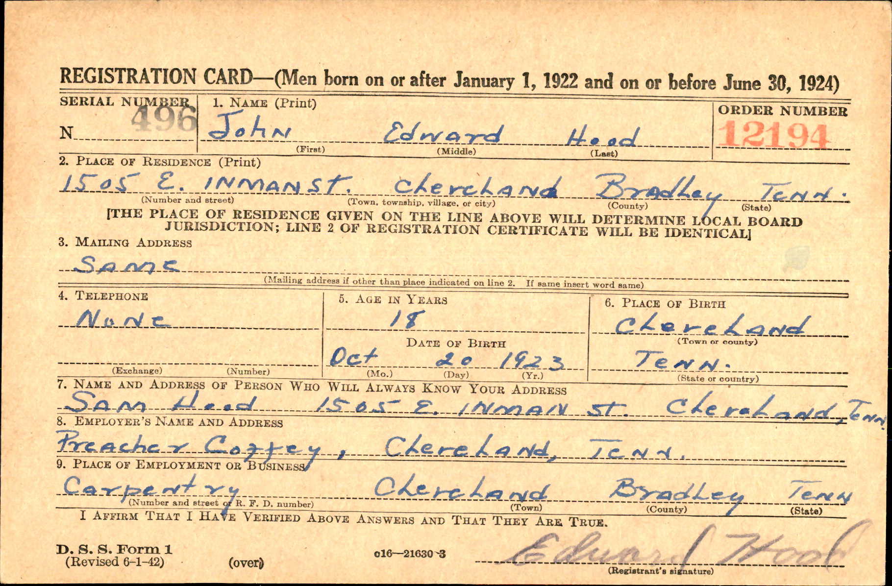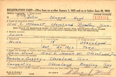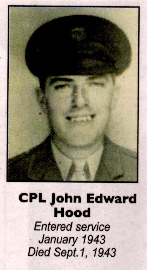 John Edward Hood was born 20 October 1923, Tennessee to Samuel Hood and Maggie Rodgers. John Hood enlisted on 1 January 1943 at Fort Oglethorpe, Georgia.