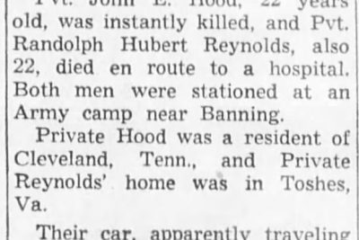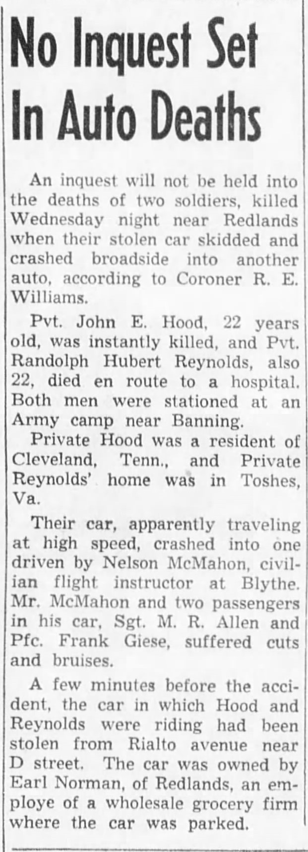 Their car, apparently traveling at high speed, crashed into one driven by Nelson McMahon, civilian flight instructor at Blythe. Mr. McMahon and two passengers in his car, Sgt. M.R. Allen and Pfc. Frank Giese, suffered cuts and bruises. A few minutes before the accident, the car in which Hood and Reynolds were riding had been stolen from Rialto avenue near D street. The car was owned by Earl Norman, of Redlands, an employe of a Wholesale grocery firm where the car was parked.