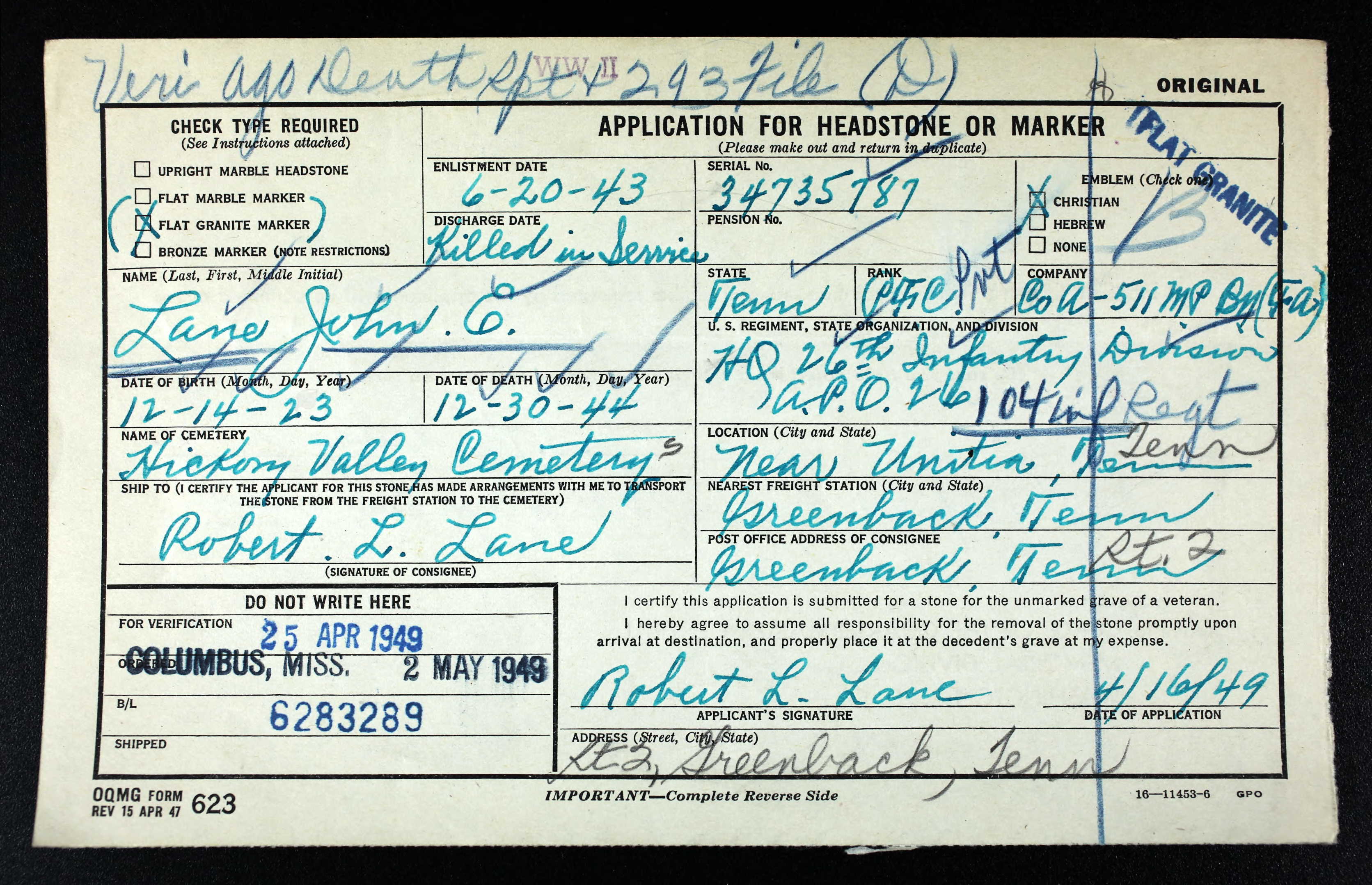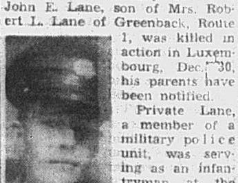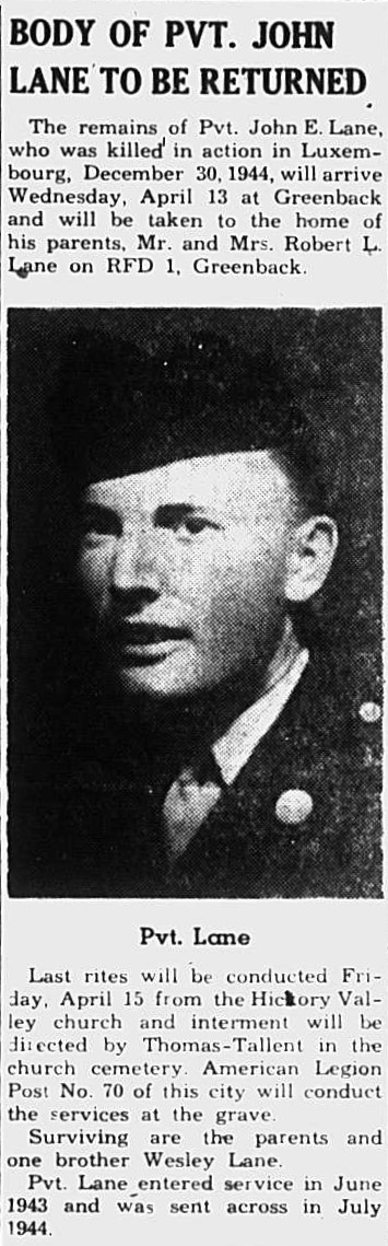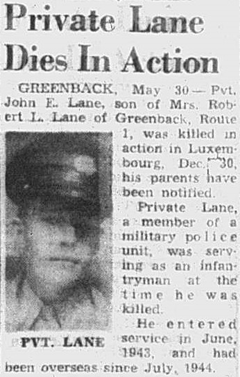 Greenback, May 30 – Pvt. John E. Lane, son of Mrs. Robert L. Lane of Greenback, Route 1, was killed in action in Luxembourg, Dec. 30, his parents have been notified. Private Lane, a member of the military police unit, was serving as an infantryman at the time he was killed. He entered service in June 1943, and had been overseas since July, 1944.