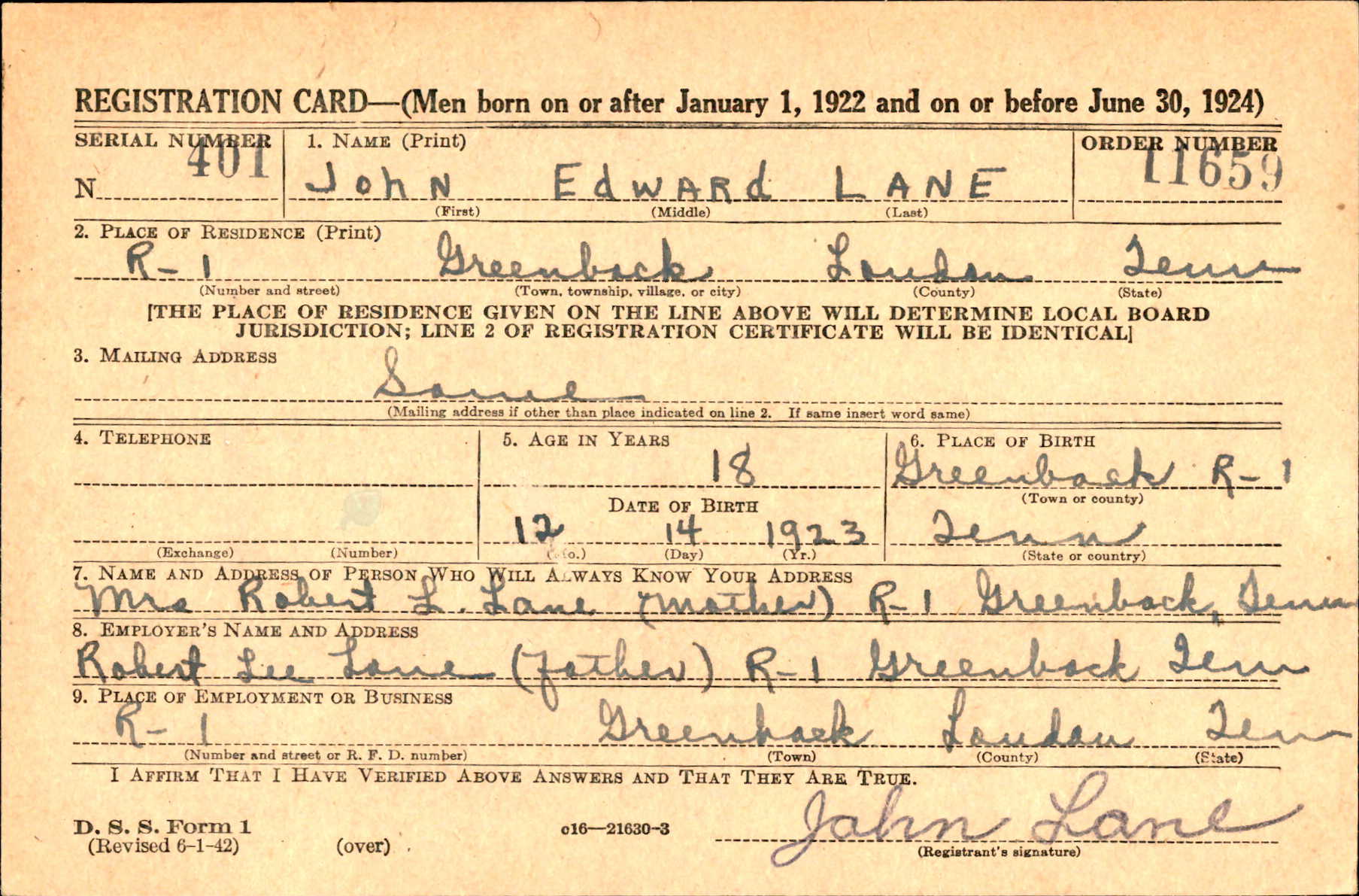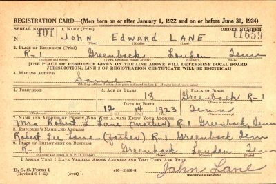 John Edward Lane was born in Greenback, Tennessee to Robert Lee Lane and Mary Emma Lou Hughes.
