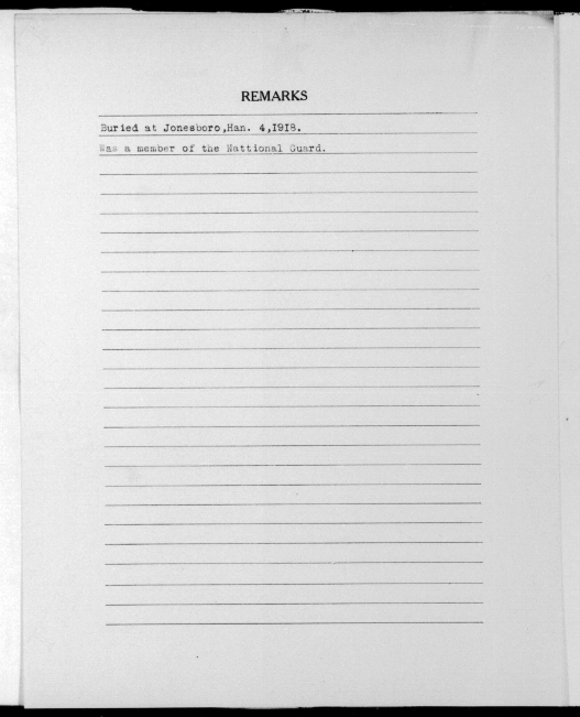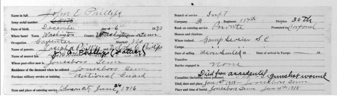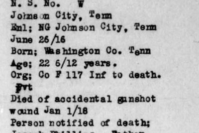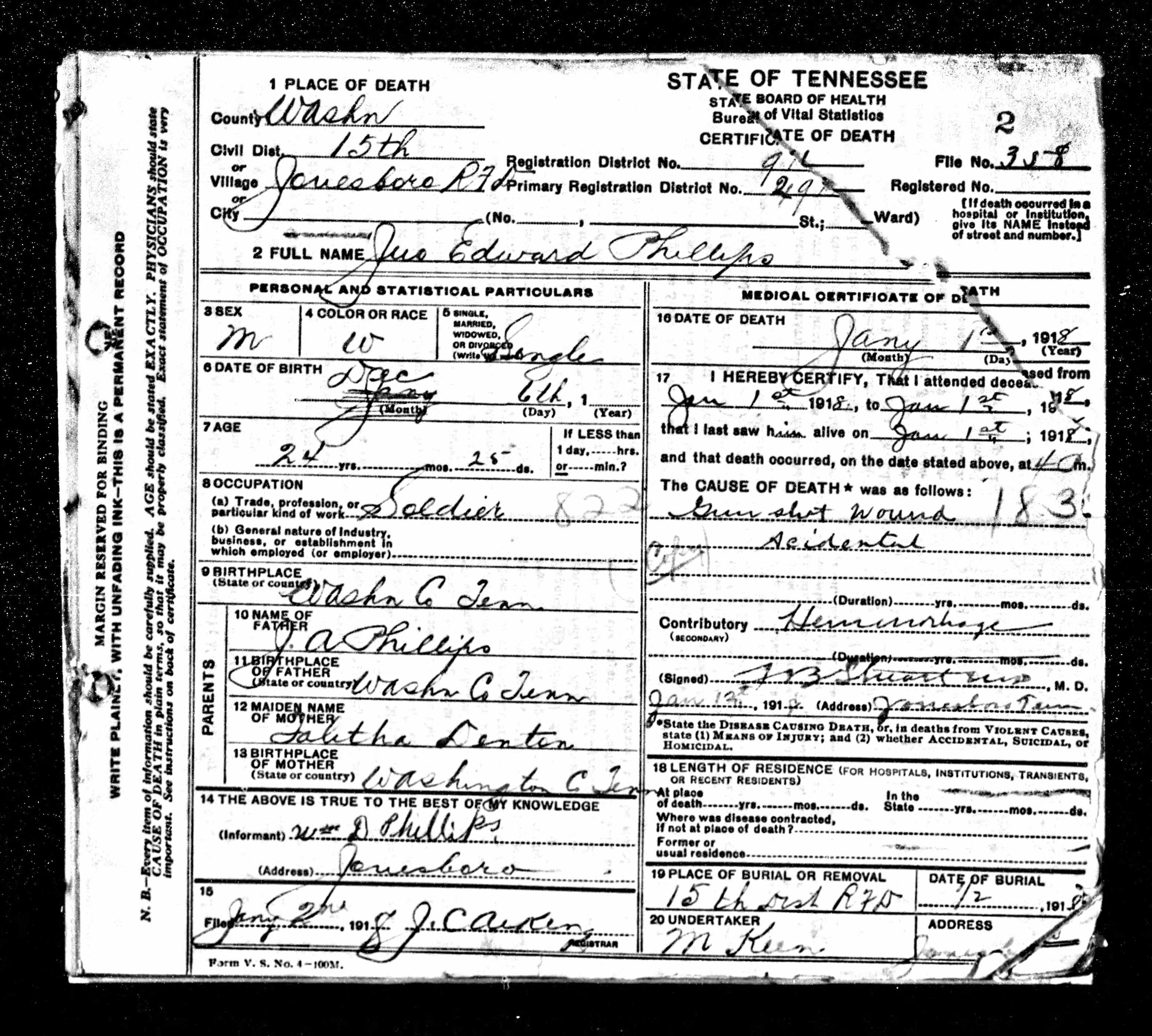 Died 1 January 1918, Jonesborough, Washington County, Tennessee of a gun shot wound.
