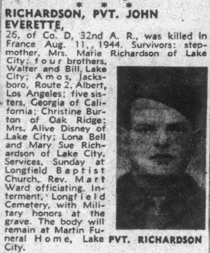 Pvt. John Everette Richardson, 26, of Co. D, 32nd A.R. was killed in France Aug. 11, 1944. Survivors: stepmother, Mrs. Marie Richardson of Lake Cityl four brothers, Walter and Bill, Lake City; Amors, Jacksboro, Route 2; Albert, Los Angeles; five sisters, Georgia of California; Christine Burton of Oak Ridge; Mrs. Alive Disney of Lake City; Lona Bell and Mary Sue Richardson of Lake City.
