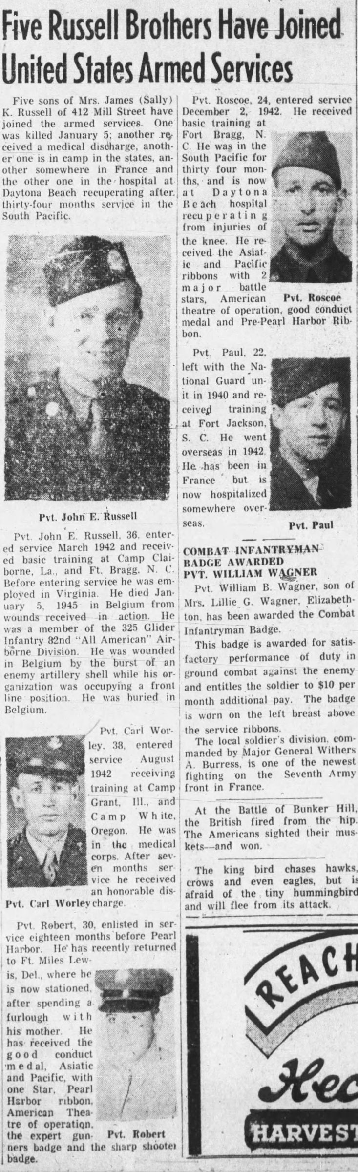 Five sons of Mrs. James (Sally) K. Russell of 412 Mill Street have joined the armed services. One was killed January 5, another received a medical discharge, another one is in camp in the states, another somewhere in France, and the other one in the hospital at Daytona Beach recuperating after thirty-four months service in the South Pacific. The sons are Pvt. Carl Worley Russell, Pvt. Robert Russell, Pvt. Roscoe Russell, Pvt. Paul Russell, and Pvt. John E. Russell.