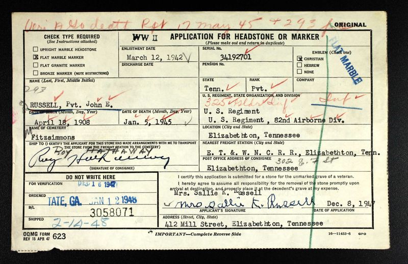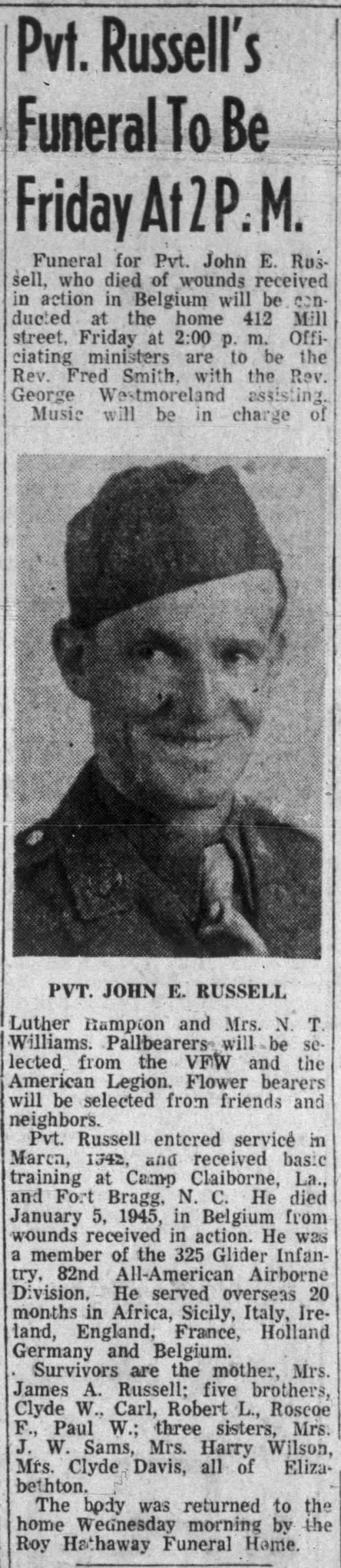 Pvt. Russell Died of wounds 5 January 1945 in Belgium.