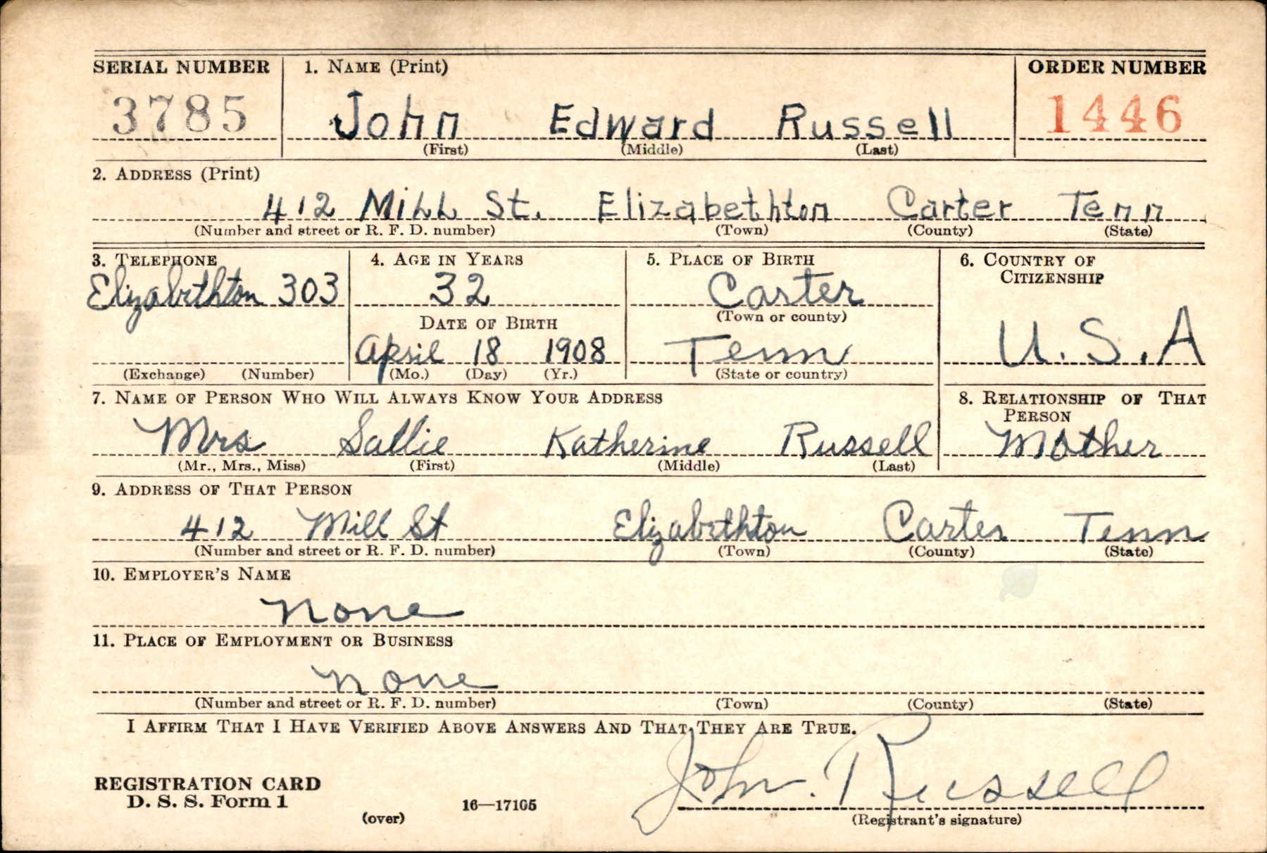 John Edward Russell was born on 18 April 1908 to James A. Russell and Sallie Katherine Webb. He was married to Ethel Lou Galliher. He was the brother of Walter Clyde Russell, Carl Worley Russell, Nellie Maude Russell, Robert Lee Russell, Mary G. Russell, Emma Lou Russell, Roscoe Franklin Russell and Paul William Russell. He married Ethel Lou Galliher on 27 December 1932 in Bristol, Virginia. Ethel died in 1938.