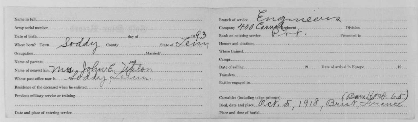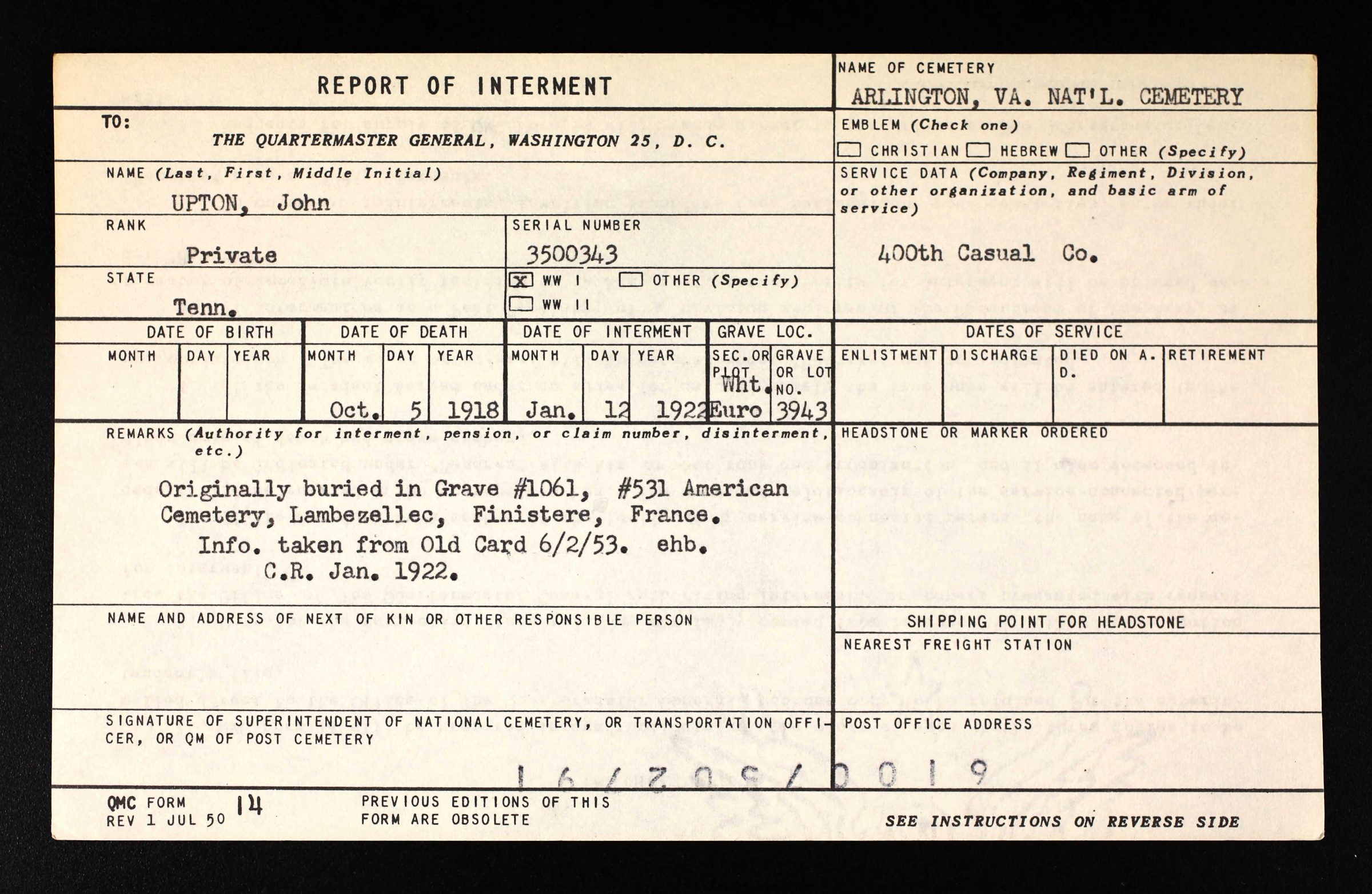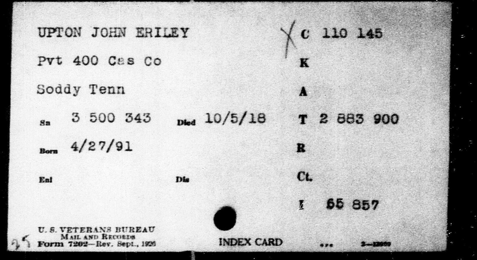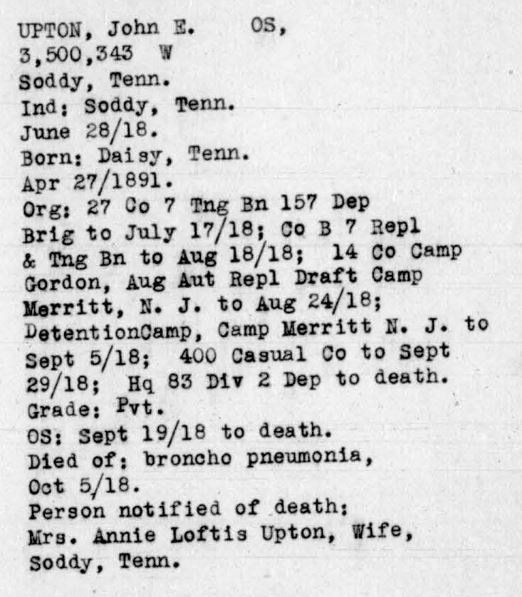 John Evily Upton was born on 27 April 1891 at Daisy, Tennessee. He was married to Annie Loftis Upton. PVt Upton inducted into military service on 28 June 1918 at Camp Gordon, Chamblee in Georgia. He was a miner before his induction. He died at the Base Hospital at Brest in France and was initially buried at the American Cemetery Lambezellec, Finistere in France.