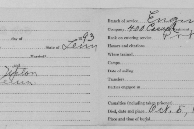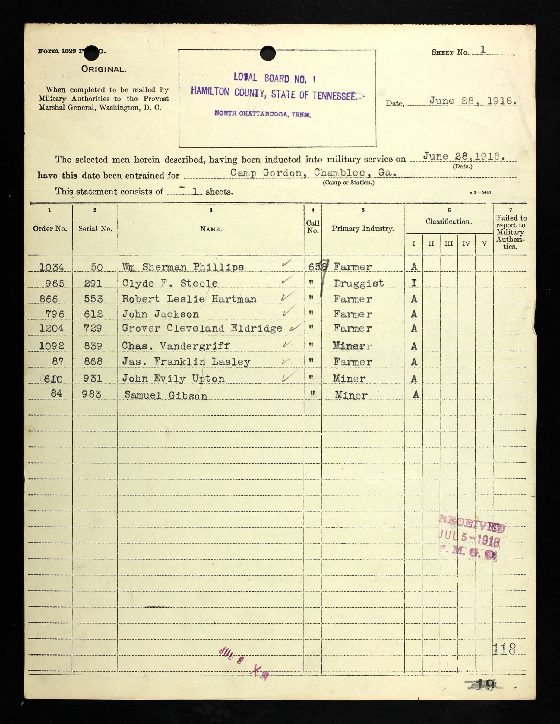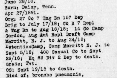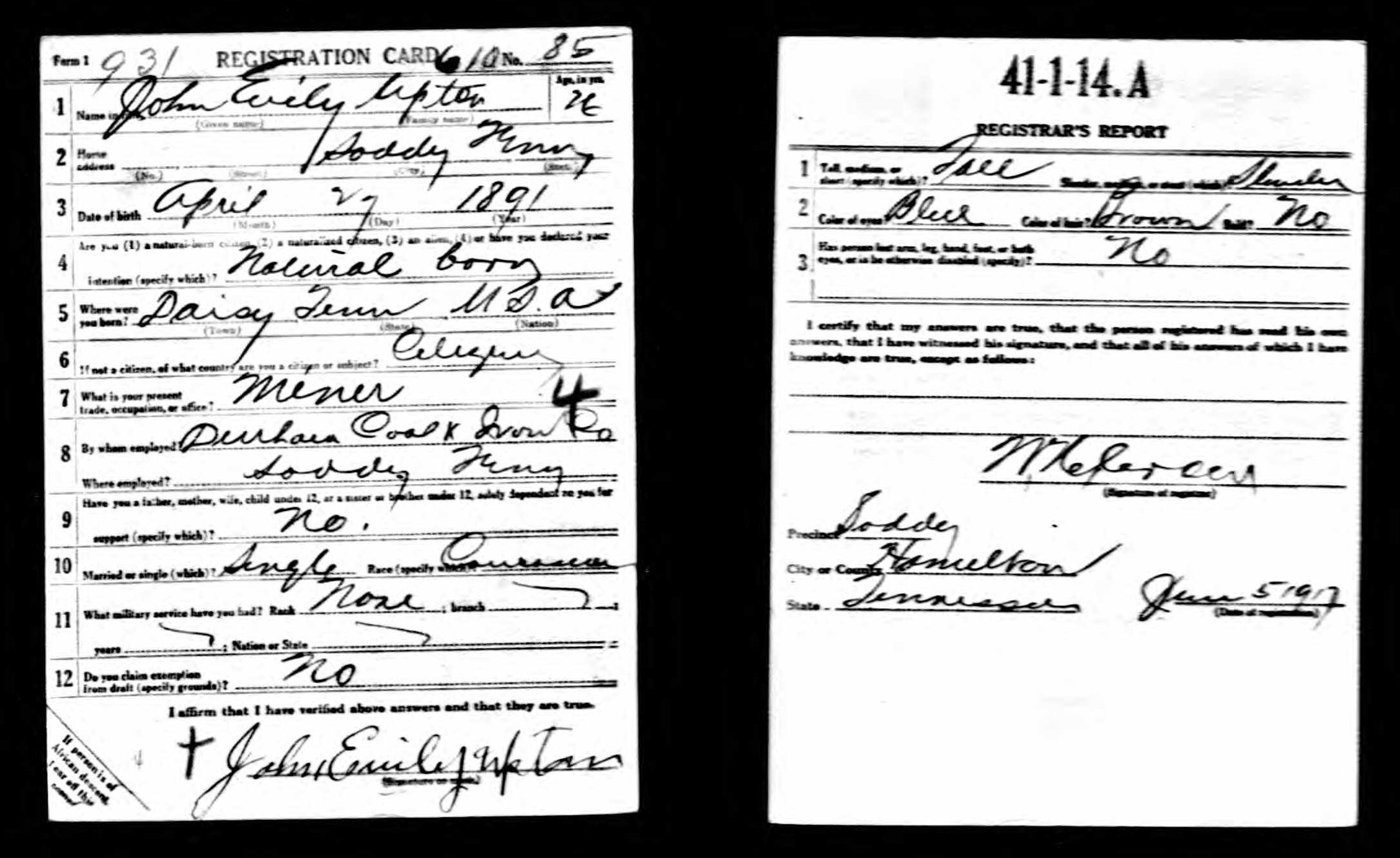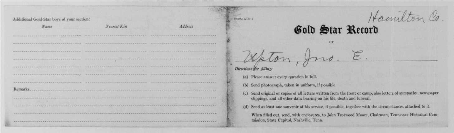 John Evily Upton was born on 27 April 1891 at Daisy, Tennessee. He was married to Annie Loftis Upton. PVt Upton inducted into military service on 28 June 1918 at Camp Gordon, Chamblee in Georgia. He was a miner before his induction. He died at the Base Hospital at Brest in France and was initially buried at the American Cemetery Lambezellec, Finistere in France.