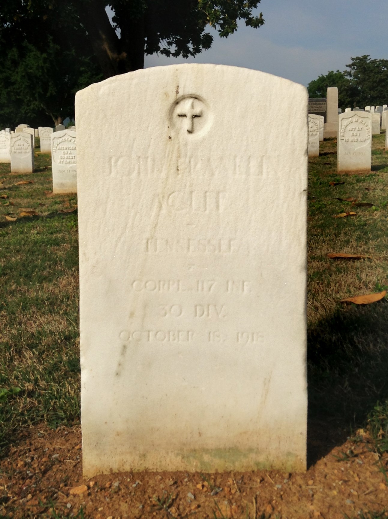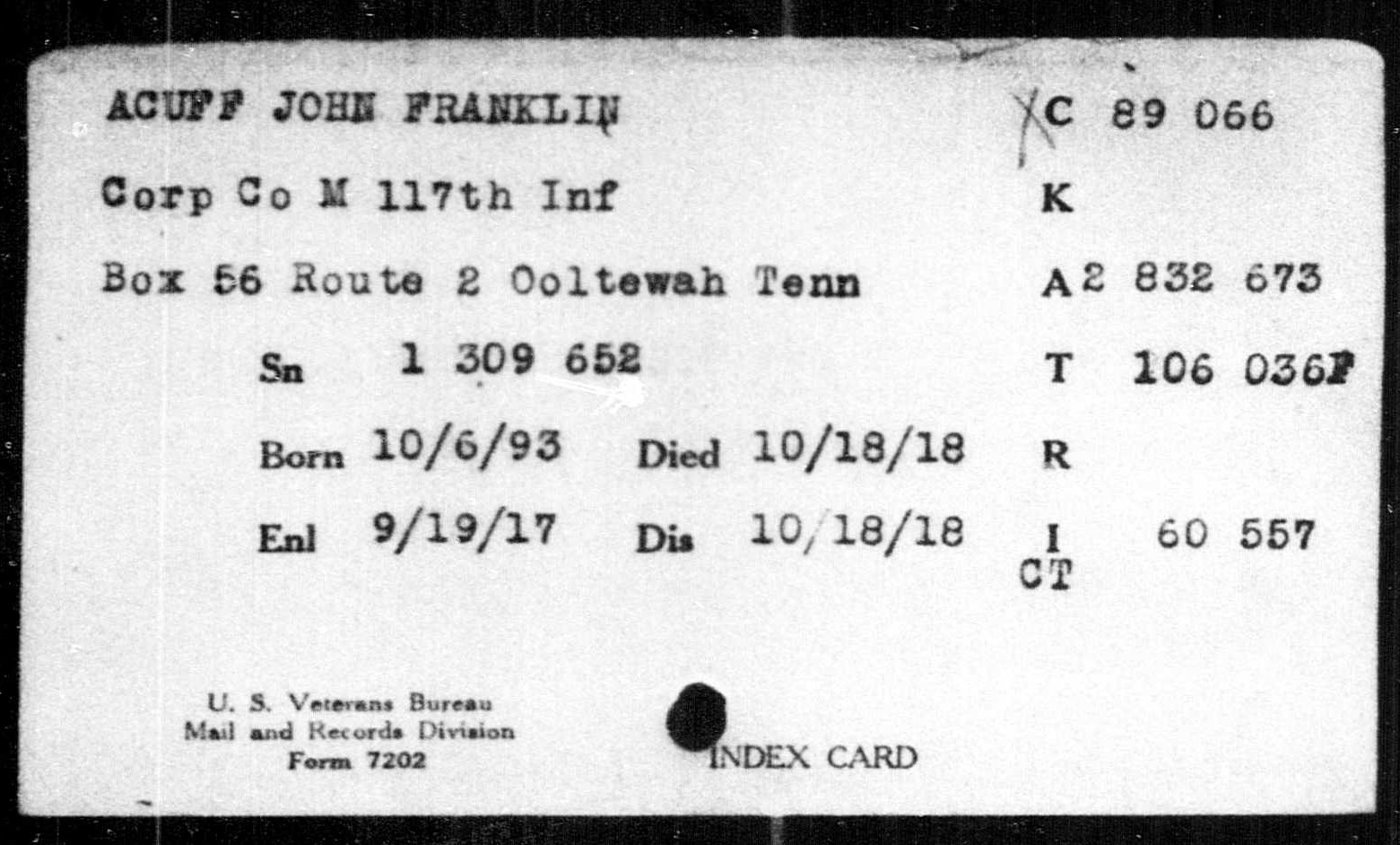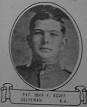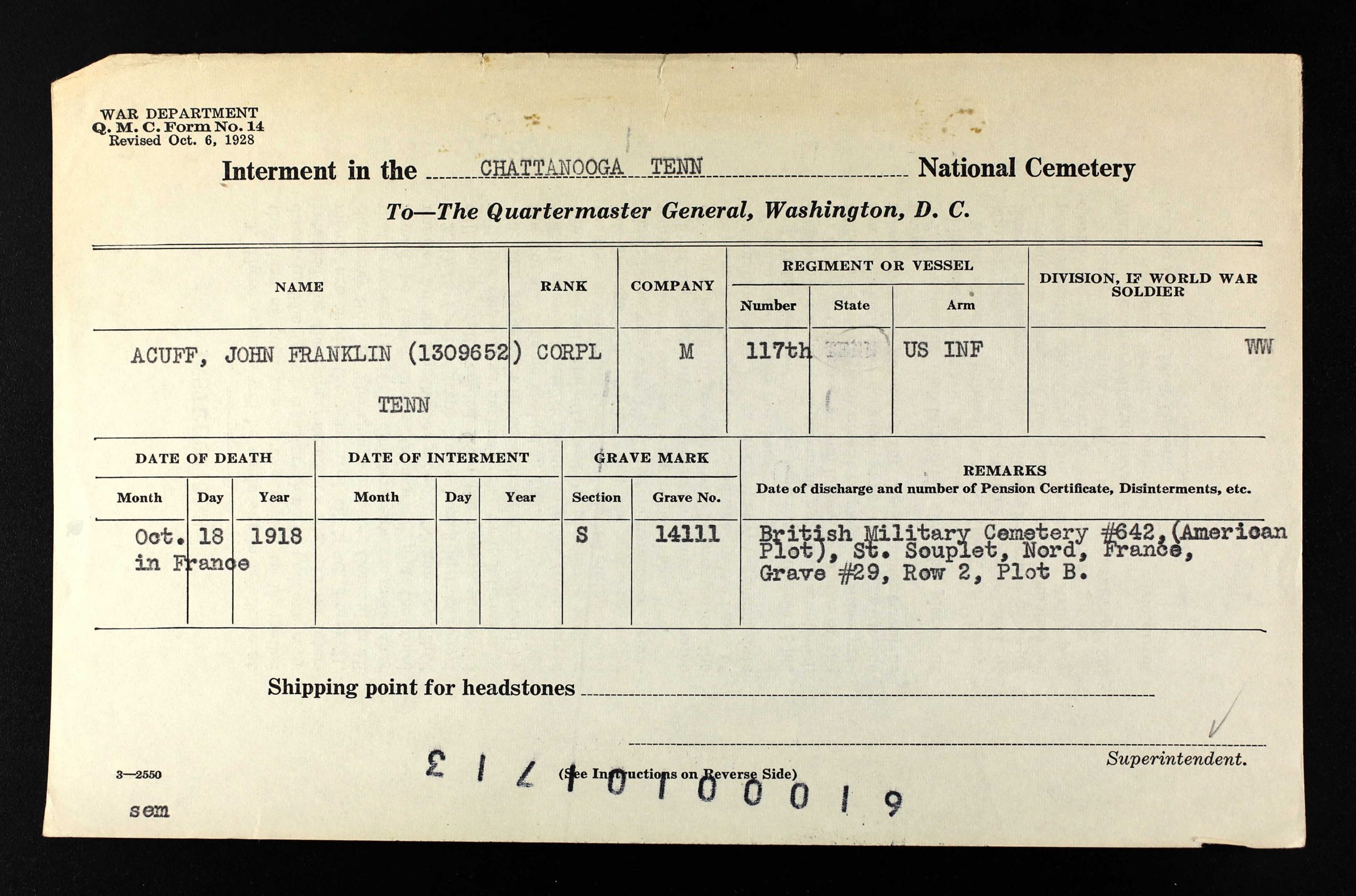 Cpl. John Franklin Acuff was born in Ooltewah, Tennessee, then the county seat of James County, on October 6, 1893. He was the oldest son of Hugh Alexander Acuff and Georgia Aurora Stanford Acuff, had five siblings, including Henry, Samuel, Cecil, Annie, and Winifred Acuff. Born into a rural family, he spent his formative years as a farmer before registering for the draft on June 5, 1917. He was killed in action at St. Souplet, France on October 18, 1918, and is buried at the Chattanooga National Cemetery in Chattanooga, Tennessee.