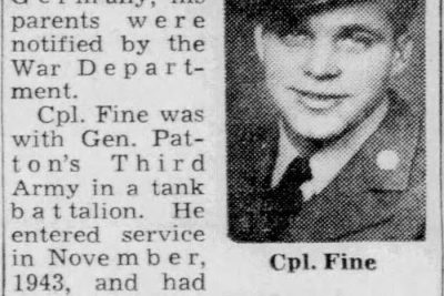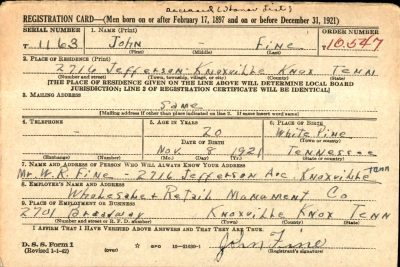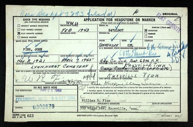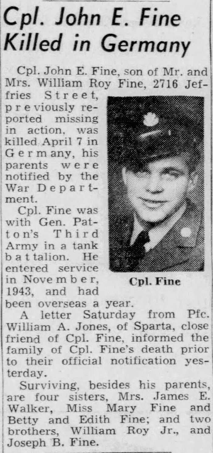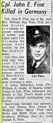 John Edward Fine was born 8 November 1921 in Knoxville, Tennessee, the son of William Roy Fine and Madge Edith Hartsell. Siblings: William Fine, Anett Fine, Mary Fine, Jae Fine, and Lenis Fine. He attended Knoxville High School and enlisted on Febuary 13, 1943 in Fort Oglethorpe, GA