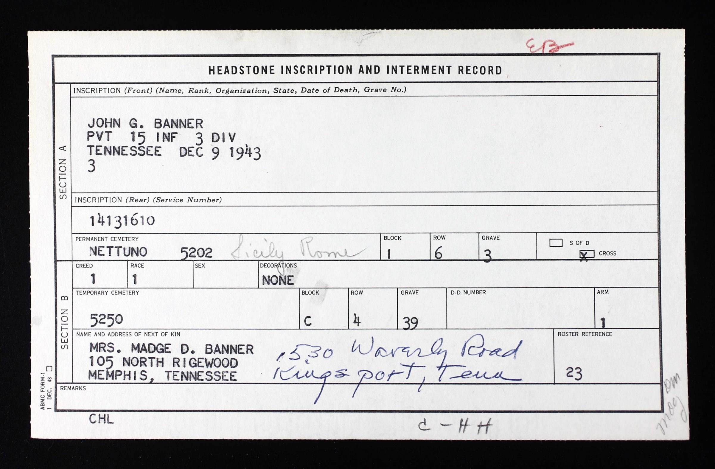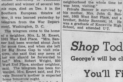 The telegram came to the home of a neighbor, Mrs. L.M. Emert, 1001 West End Place. “Mrs. Banner had been worried about Jack for some time, and when she left for Big Stone Gap to visit relatives, she said that any news of her son should be forwarded to her,” Mrs. Robert Wright, 930 West End Place, another neighbor said. The telegram has been forwarded, Mrs. Emert said, and Private Banner’s mother is expected home tomorrow night.