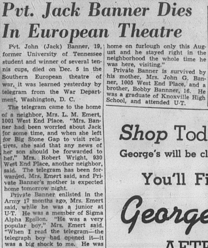 Pvt. John (Jack) Banner, 19, former University of Tennessee student and winner of several tennis cups, died on Dec. 5 in the Southern European theatre of war, it was learned yesterday by telegram from the War Department, Washington D.C.