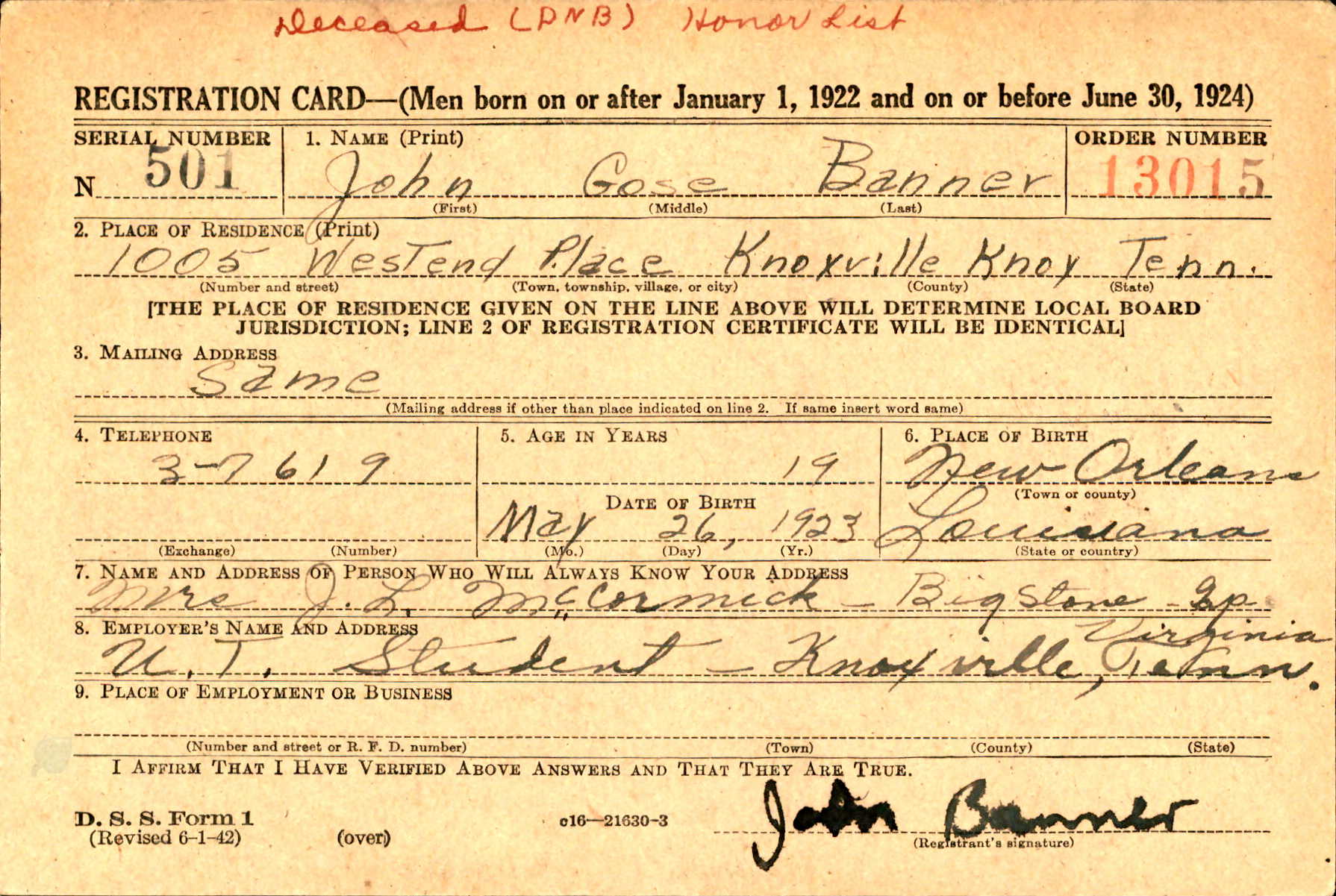Private Banner is survived by his mother, Mrs. John G. Banner, 1005 West End Place, and a brother, Bobby Banner, 16. He was a graduate of Knoxville High School and attended U-T.