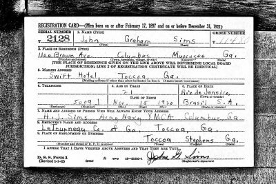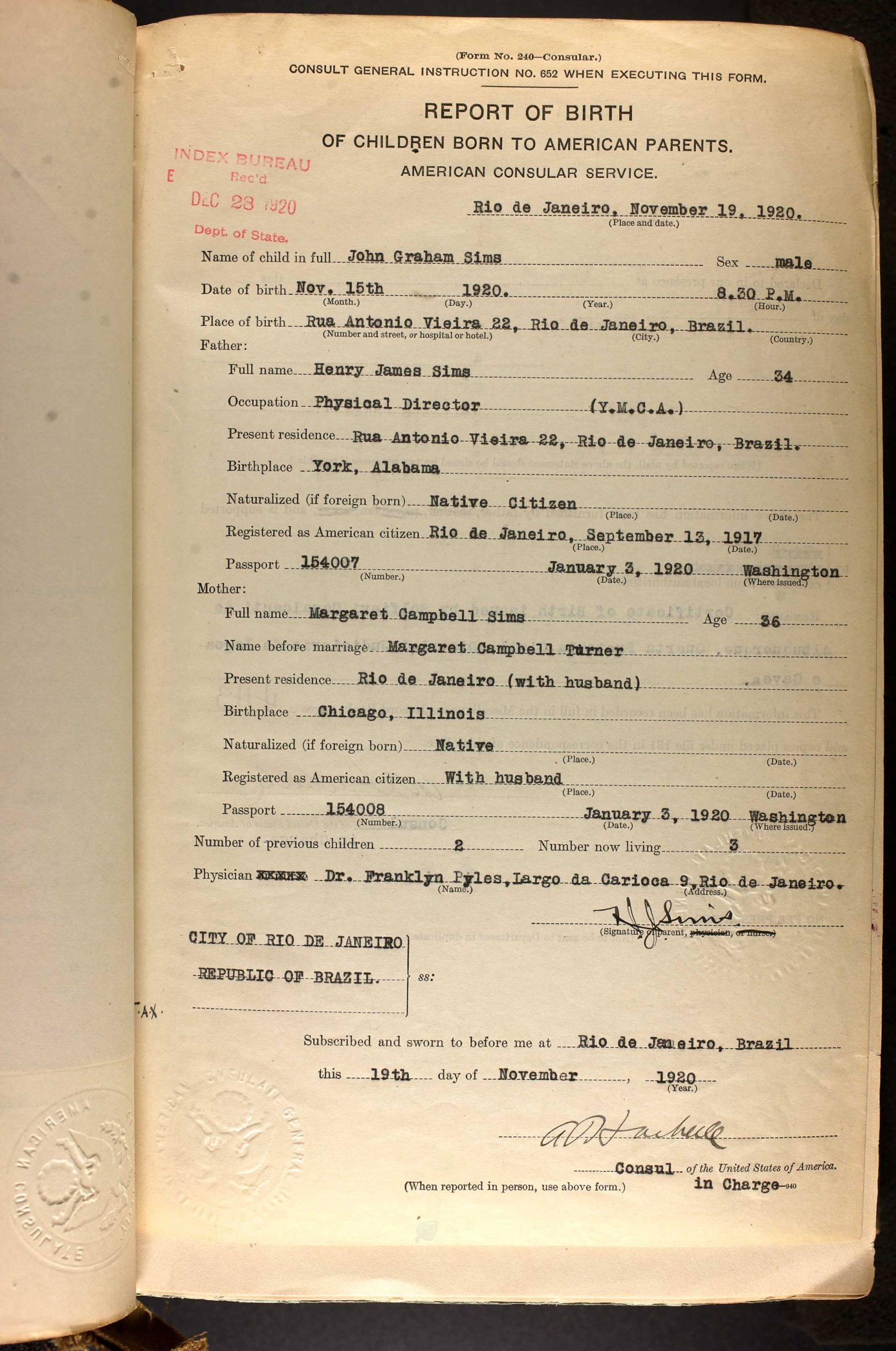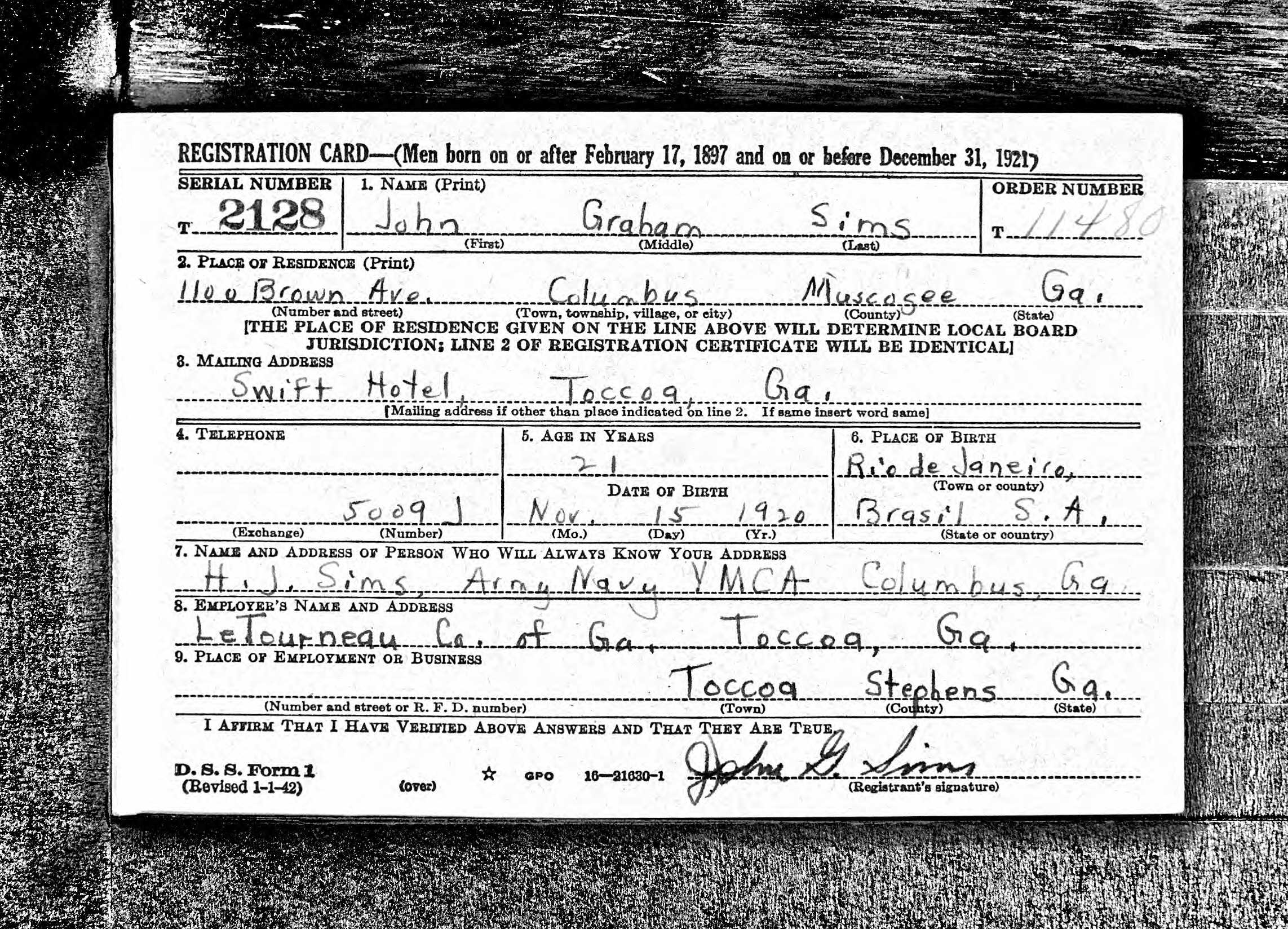 John Graham Sims was born in Rio de Janeiro, Brazil on 15 November 1920 to Henry James Sims and Margaret Campbell Turner. He was a graduate of McCallie High School, class of