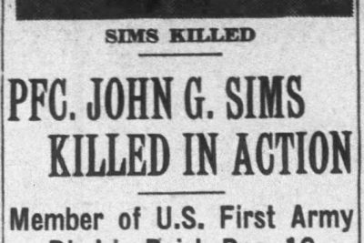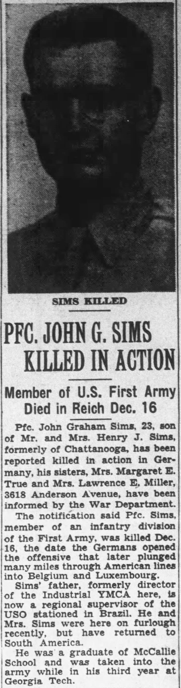 Pfc. John Graham Sims, 23, son of Mr. and Mrs. Henry J. Sims, formerly of Chattanooga, has been reported killed in action in Germany, his sisters, Mrs. Margaret E. True and Mrs. Lawrence E. Miller, 3618 Anderson Avenue, have been informed by the War Department. The notification said Pfc. Sims, member of an infantry division of the First Army, was killed Dec. 16, the date the Germans opened the offensive that later plunged many miles through American Lines into Belgium and Luxembourg. Sims ‘ father, formerly director of the Industrial YMCA here, is now a regional supervisor of the USO stationed in Brazil. He and Mrs. Sims were here on furlough recently, but have returned to South America. He was a graduate of McCallie School and was taken into the army while in his third year at Georgia Tech.
