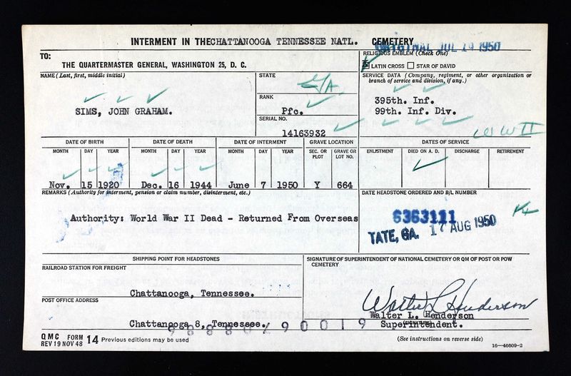 PFC Sims was returned from overseas. Buried at Chattanooga National Cemetery, Y, 644.