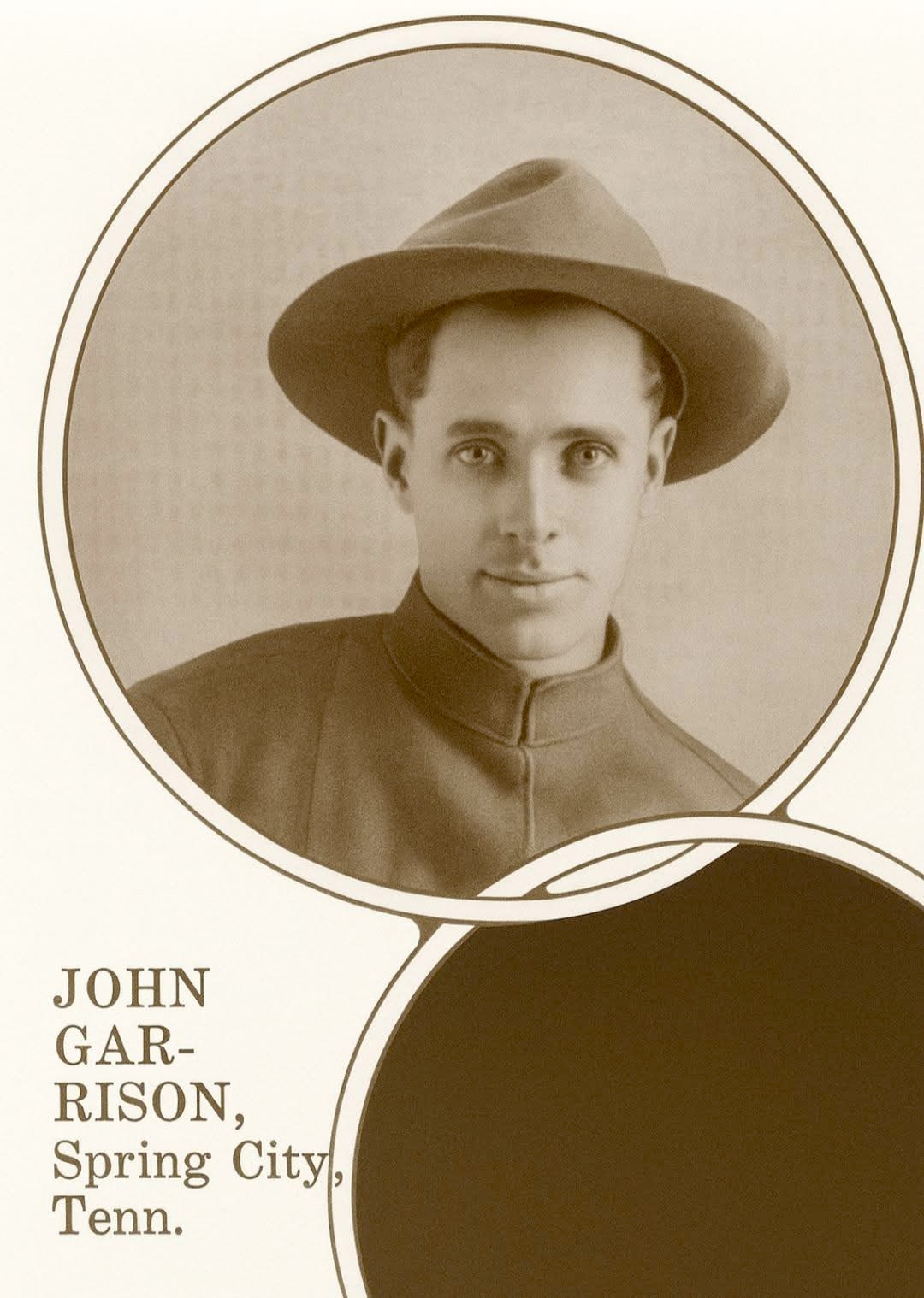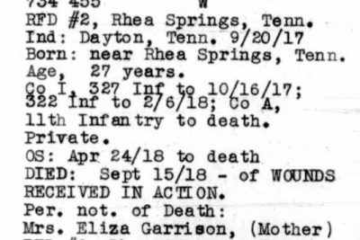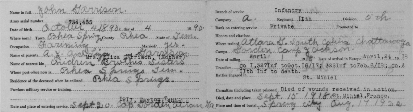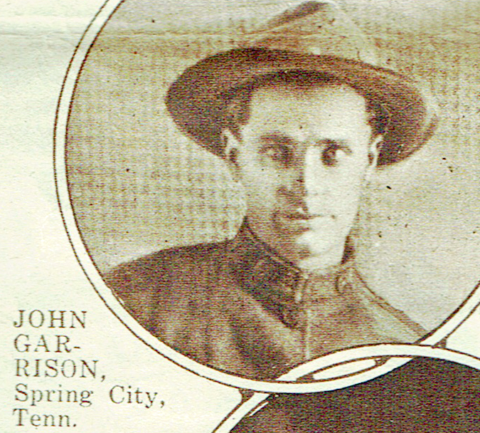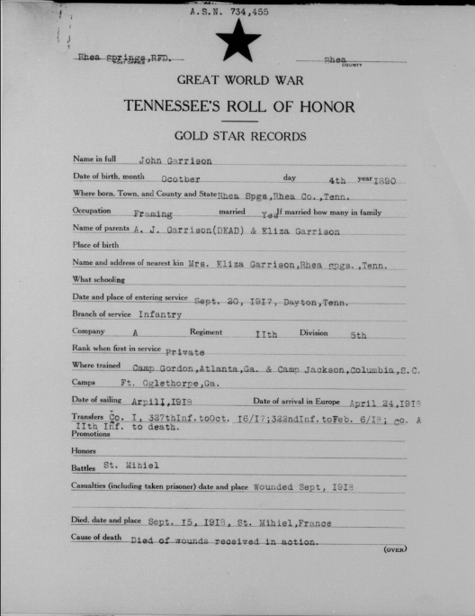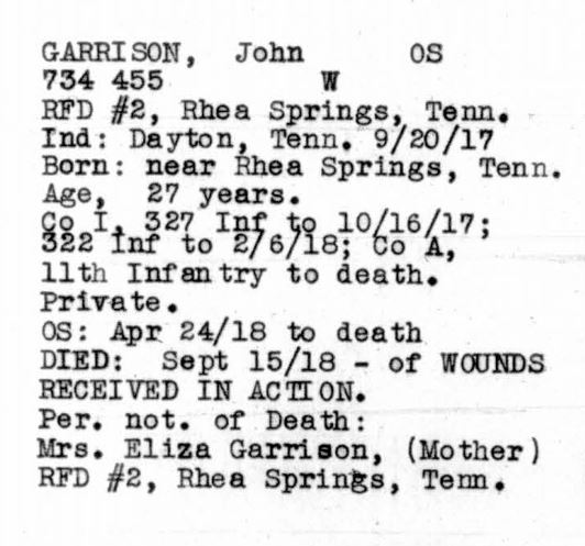 John Garrison was born 4 October 1890, Rhea Spring, Tennessee to A.J. and Eliza Garrison. He entered the service September 20, 1917 in Dayton, Tn and trained at Camp Gordon, Atlanta, Georgia; Camp Jackson, Columbia, S.C. and Fort Oglethorpe in Georgia. He sailed to Europe April 1, 1918 arriving on April 24. He was wounded in action in September and died of his wound on 15 September 1918 at St. Mihiel in France.
