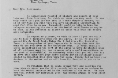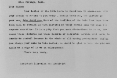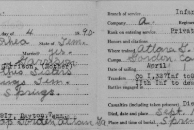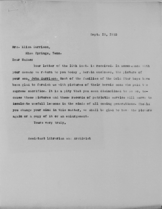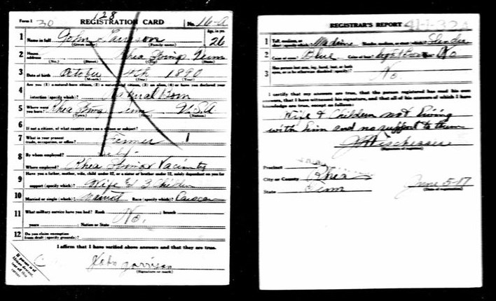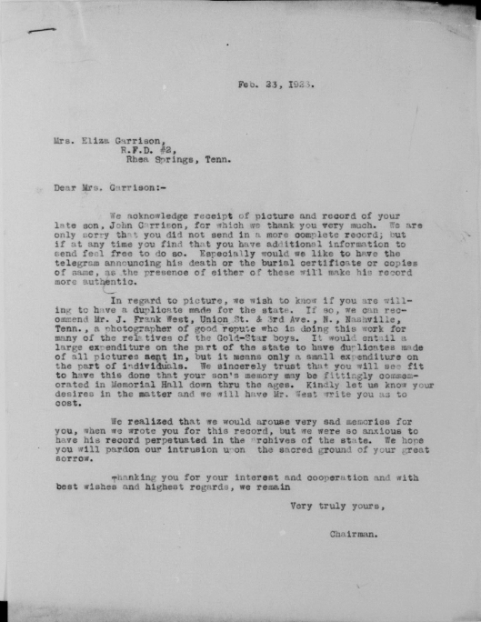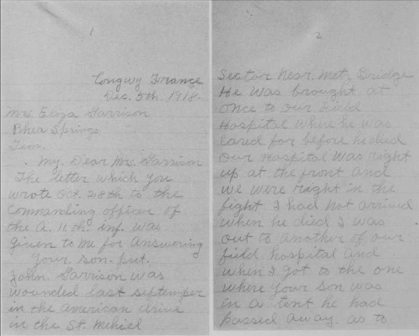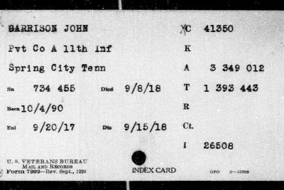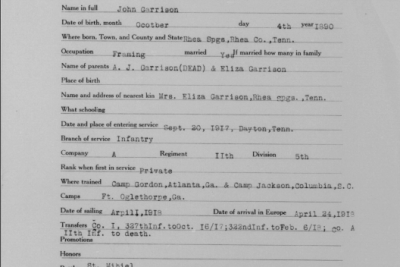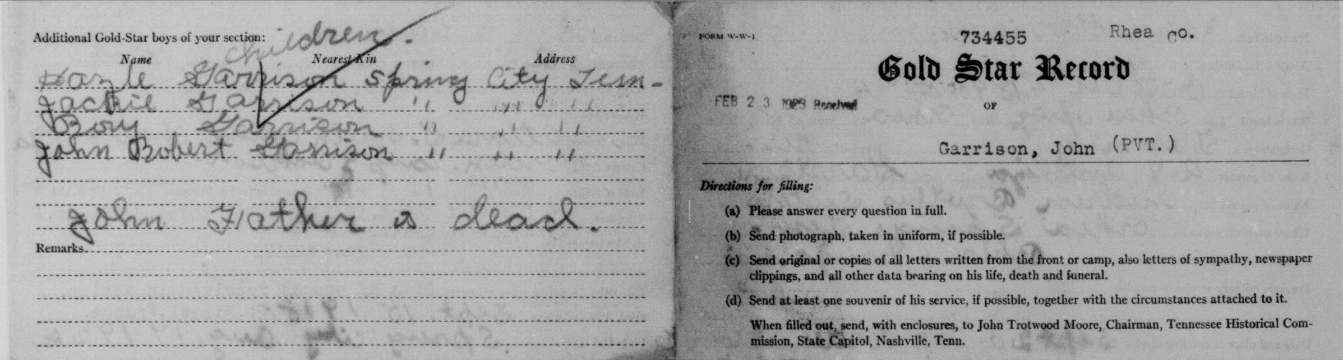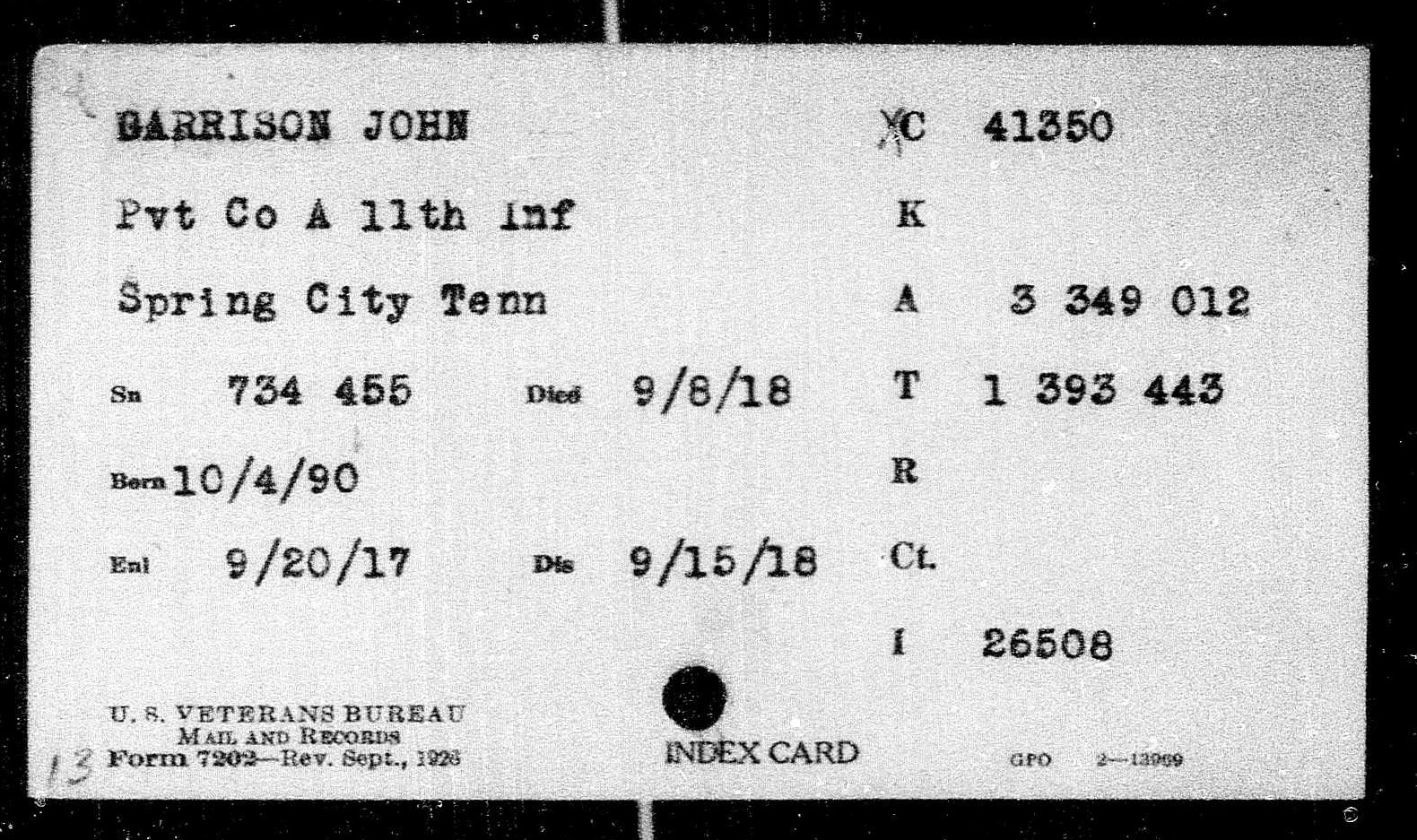 John Garrison was born 4 October 1890, Rhea Spring, Tennessee to A.J. and Eliza Garrison. He entered the service September 20, 1917 in Dayton, Tn and trained at Camp Gordon, Atlanta, Georgia; Camp Jackson, Columbia, S.C. and Fort Oglethorpe in Georgia. He sailed to Europe April 1, 1918 arriving on April 24. He was wounded in action in September and died of his wound on 15 September 1918 at St. Mihiel in France.