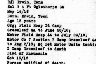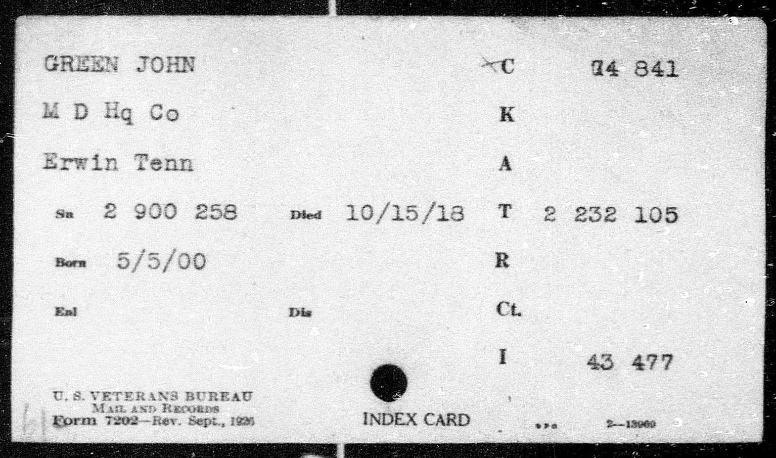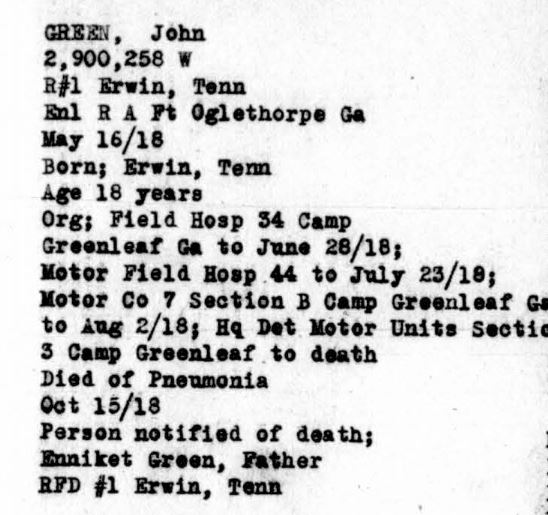 John Green of Erwin, TN was born on November 13, 1900. He was the son of Enniket Green. He enlisted in the military on May 16, 1918. He died of pneumonia on October 16, 1918 in Camp Greenleaf, Georgia. He is buried in Jobe Cemetery in Unicoi County, Tennessee.