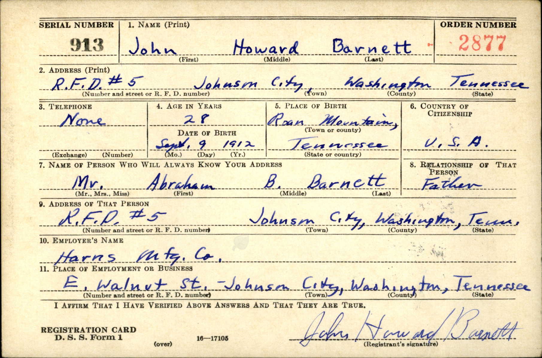 John Howard Barnett was born in Roan Mountain, Tennessee to Abraham “Abe”B. Barnett and Flora Watkins.