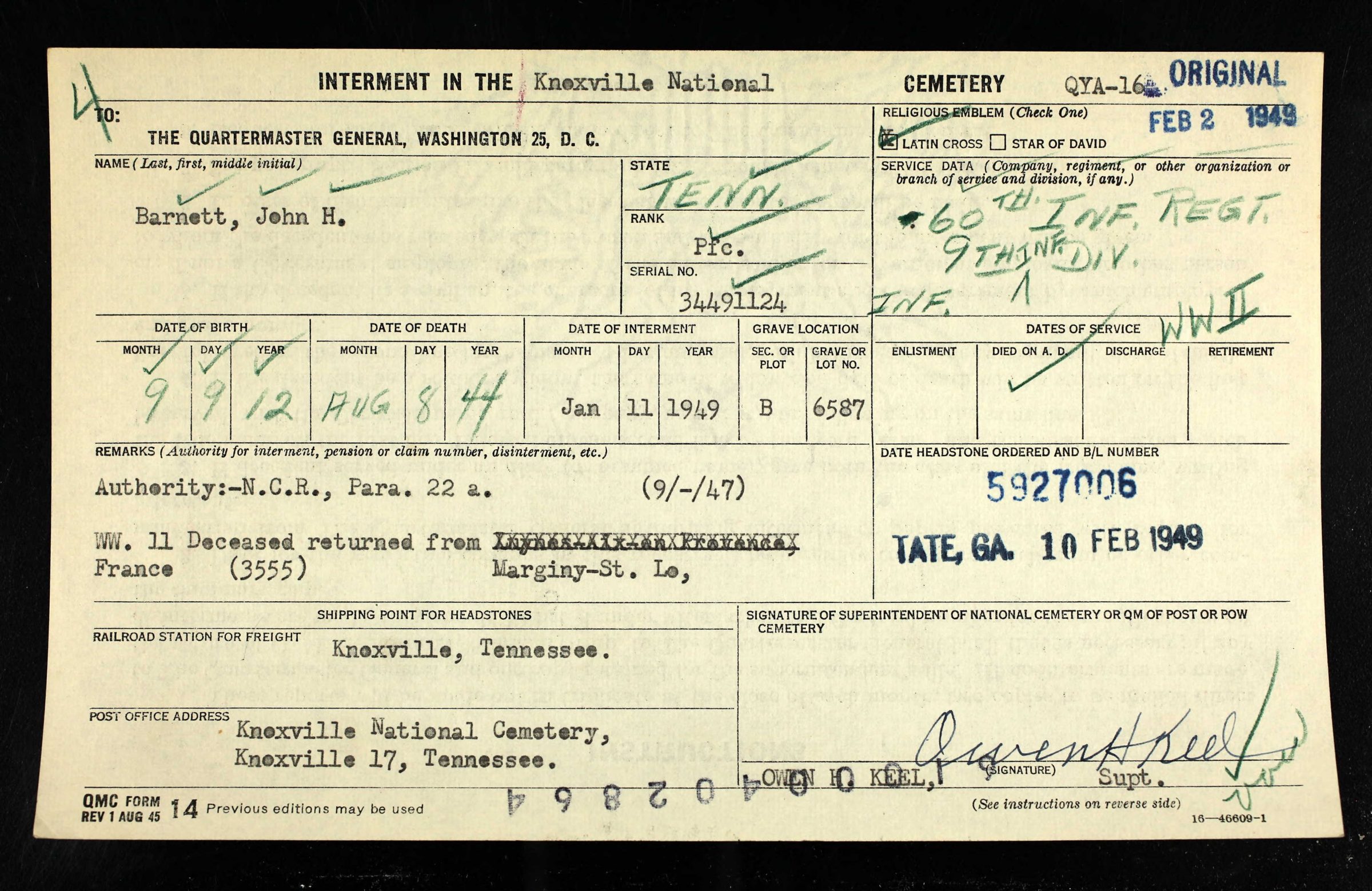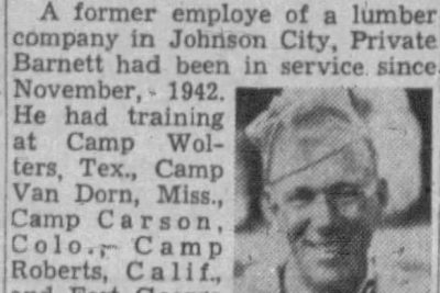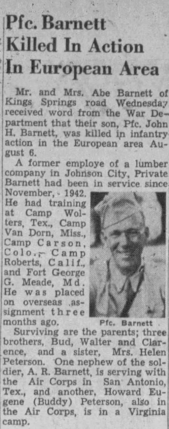 Mr. and Mrs. Abe Barnett of Kings Springs road Wednesday received word from the War Department that their son, Pfc. John H. Barnett, was killed in infantry action in the European area August 6. A former employe of a lumber company in Johnson City, Private Barnett had been in service since November, 1942. He had training at Camp Wolters, Tex., Camp Van Dorn, Miss., Camp Carson, Colo., Camp Roberts, Calif., and Fort George G. Meade, Md. He was place don overseas assignment three months ago. Surviving are the parents; three brothers, Bud, Walter and Clarence, and a sister, Mrs. Helen Peterson. One nephew of the soldier, A.R. Barnett, is serving with the Air Corps in San Antonio, Tex., and another, Howard Eugene (Buddy) Peterson, also in the Air Corps, is in a Virginia camp.