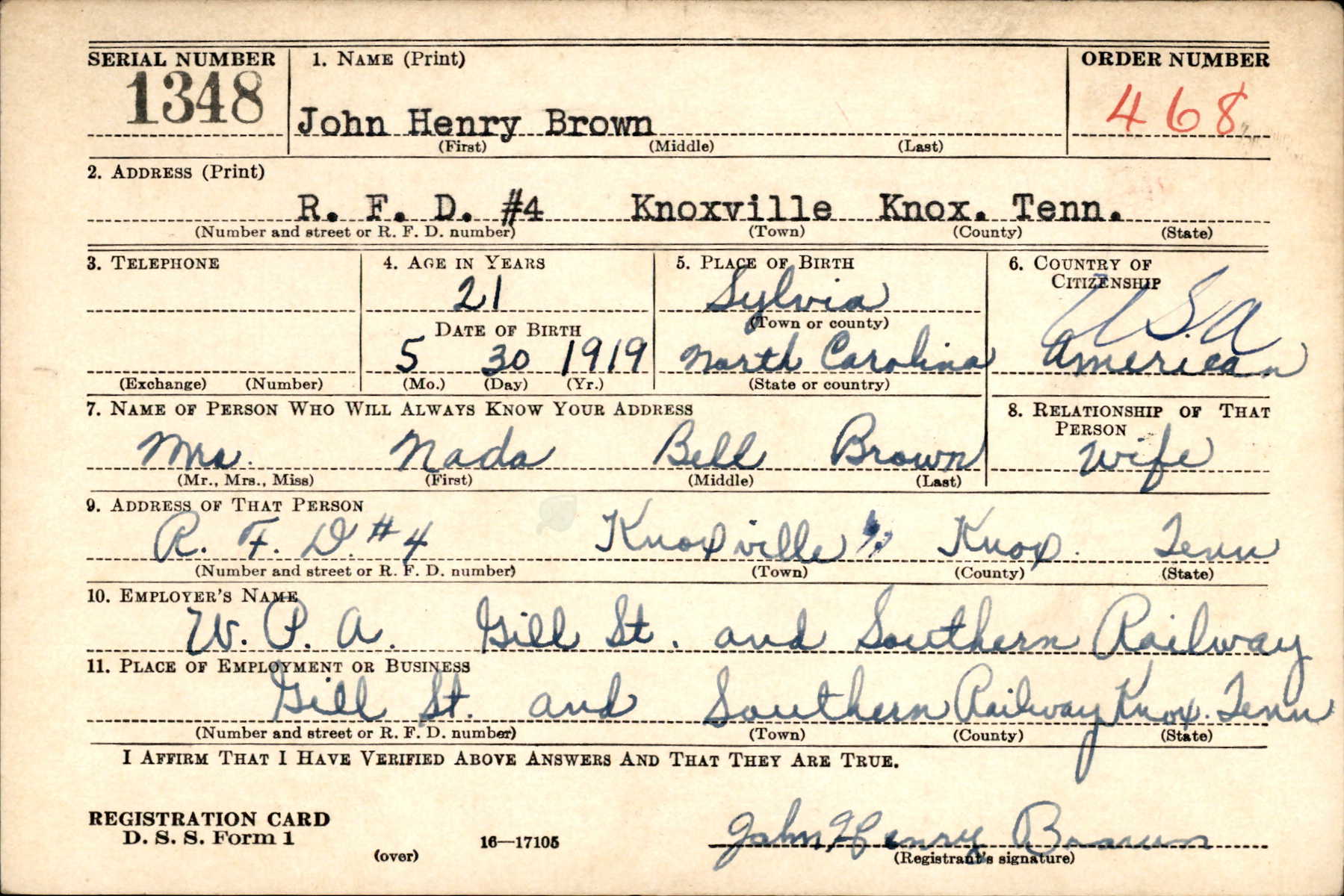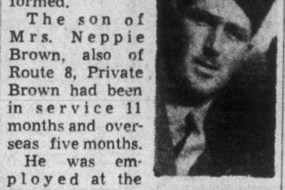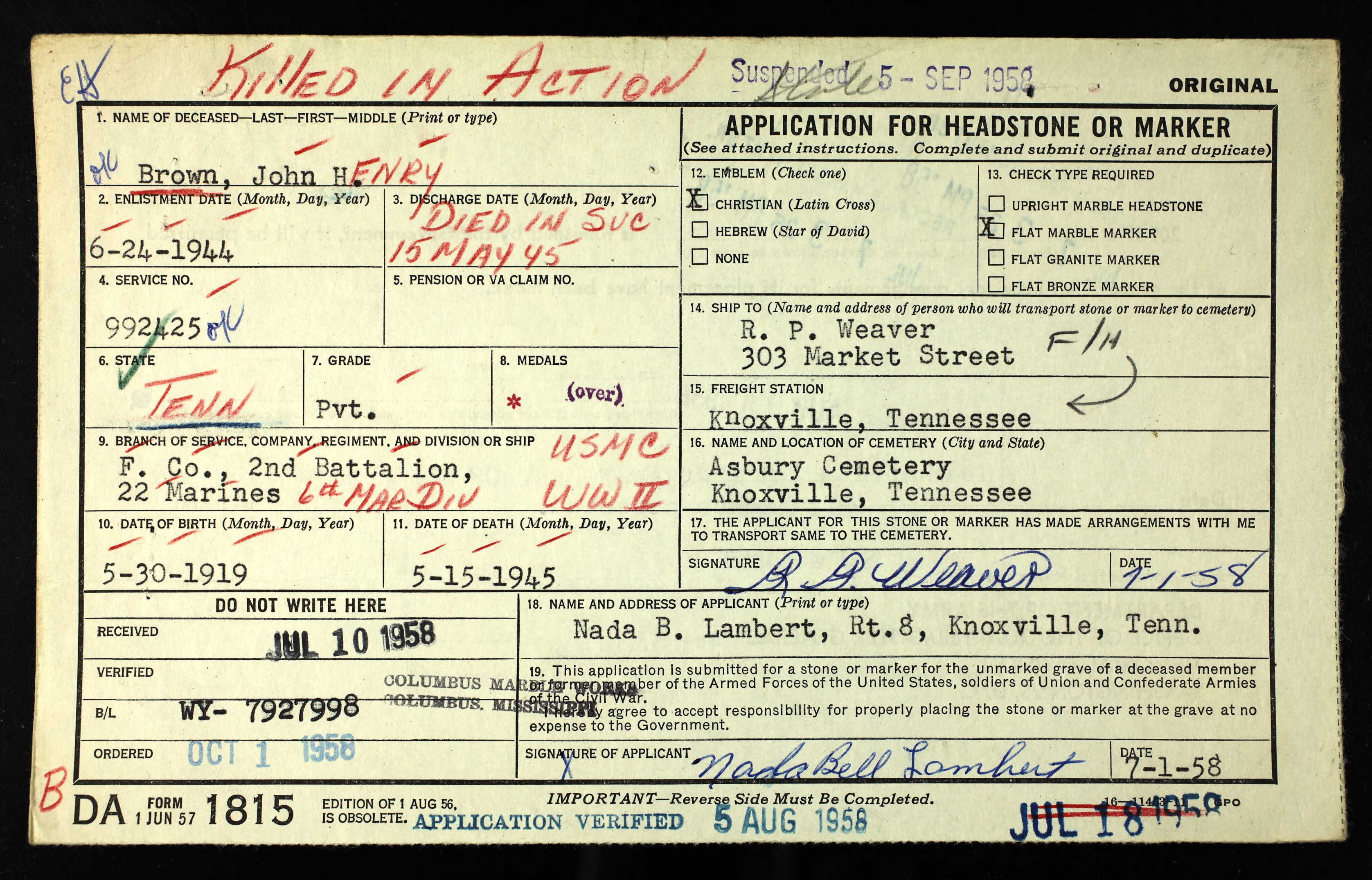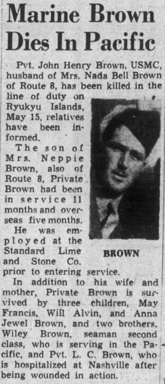 He was survived by mother, Mrs. Neppie Nelson, wife, Mrs. Nada Belle Brookshire Lambert, son, Will Alvin Brown, daughters, Mary Frances and Anna Jewel, brothers, L.C. and Shirley Brown, sister, Mrs. Violet Hurst. He was returned to the United States and funeral services were held March 13, 1949, at Marbledale Church of God. He was buried at Asbury Cemetery, Knoxville, with the John Lilly Detachment of the Marine Corps in charge of military services at the graveside.