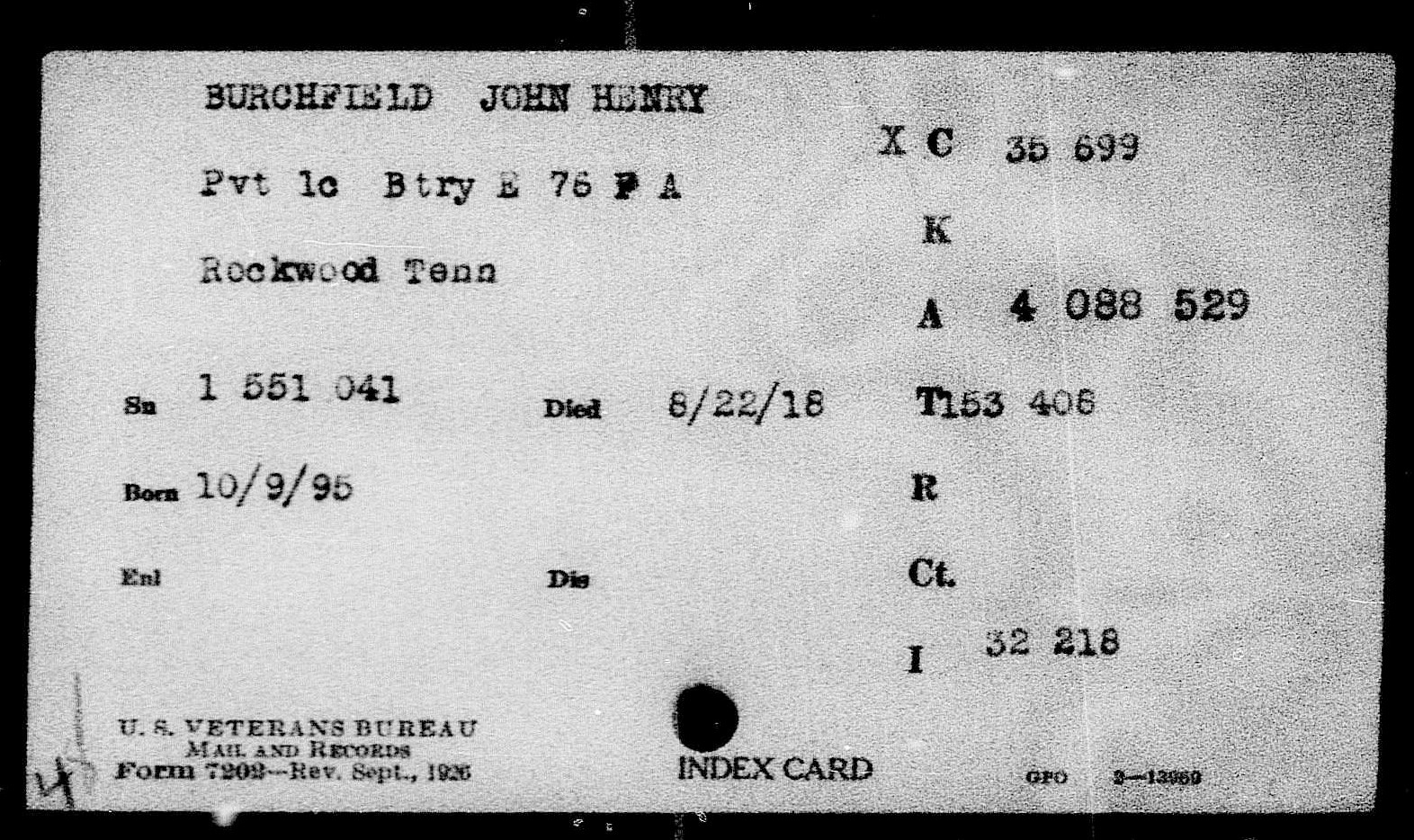 John Henry Burchfield was born in Rockwood, Tennessee, son of John L. Burchfield and Mary Elizabeth Brown. He married Flora Shelton in 1912 and was father of Mary Cali Burchfield who died when she was one year old.