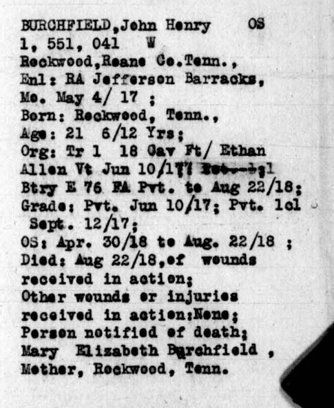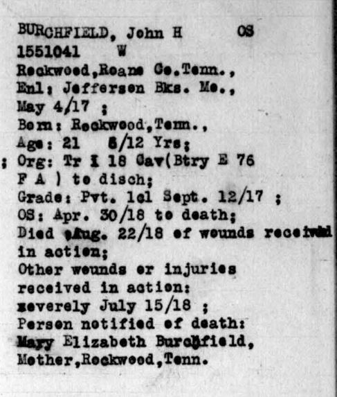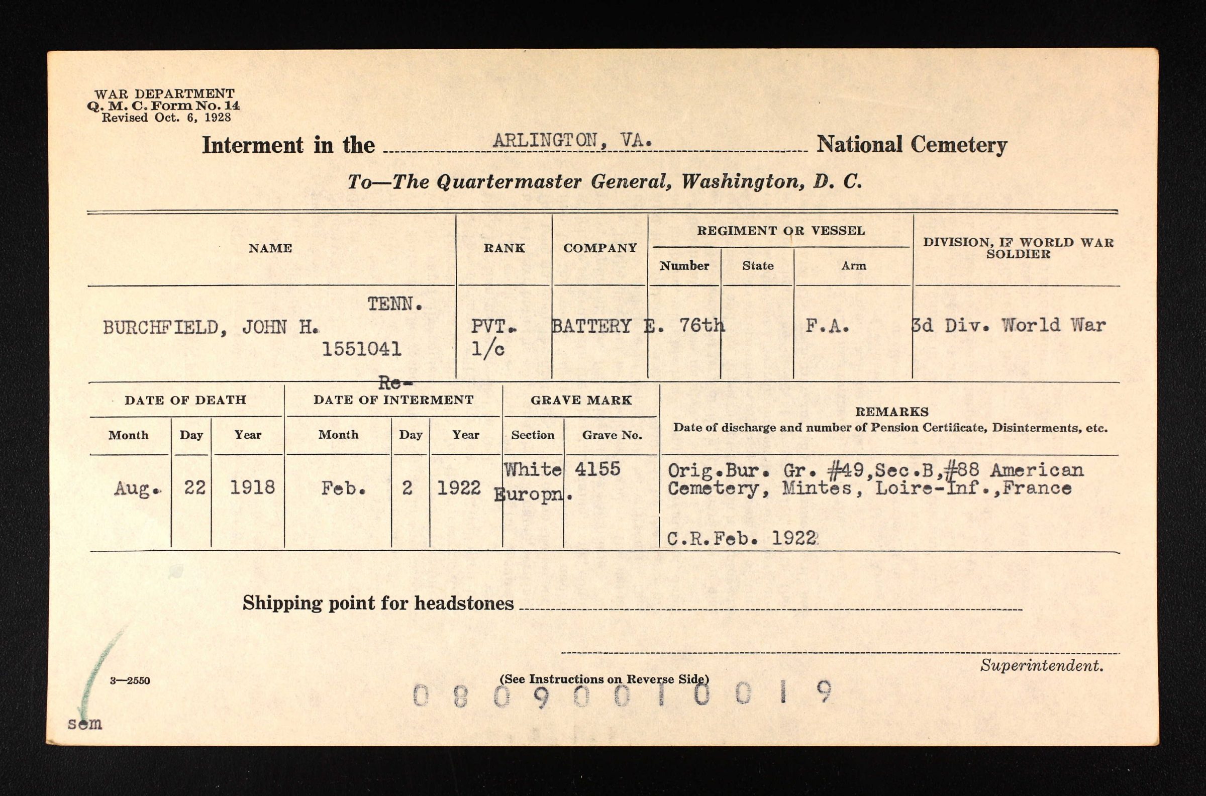 PFC Burchfield died of wounds received in action and was initially buried at the American Cemetery, Mintes, Loire-Inférieure, France.