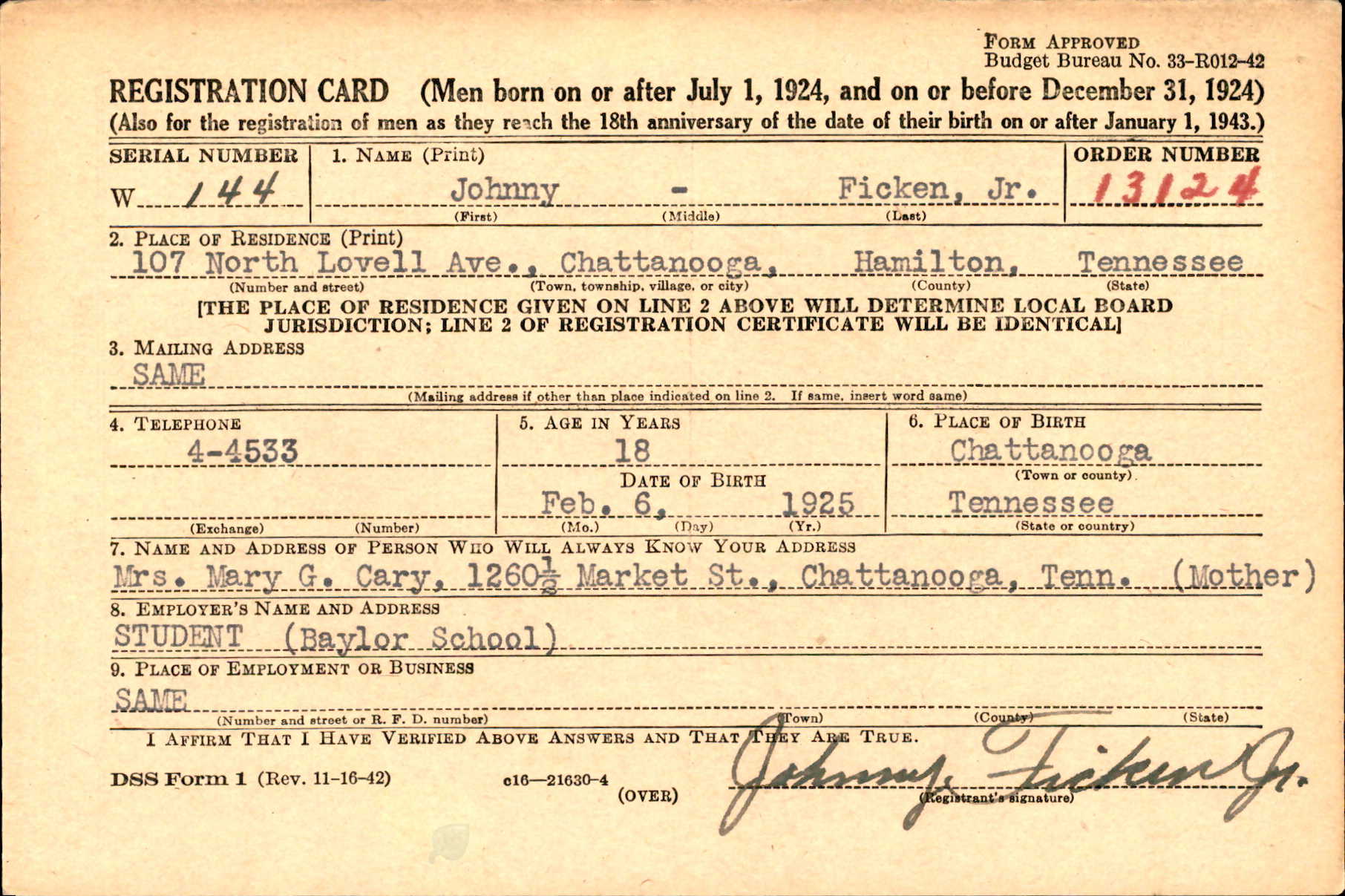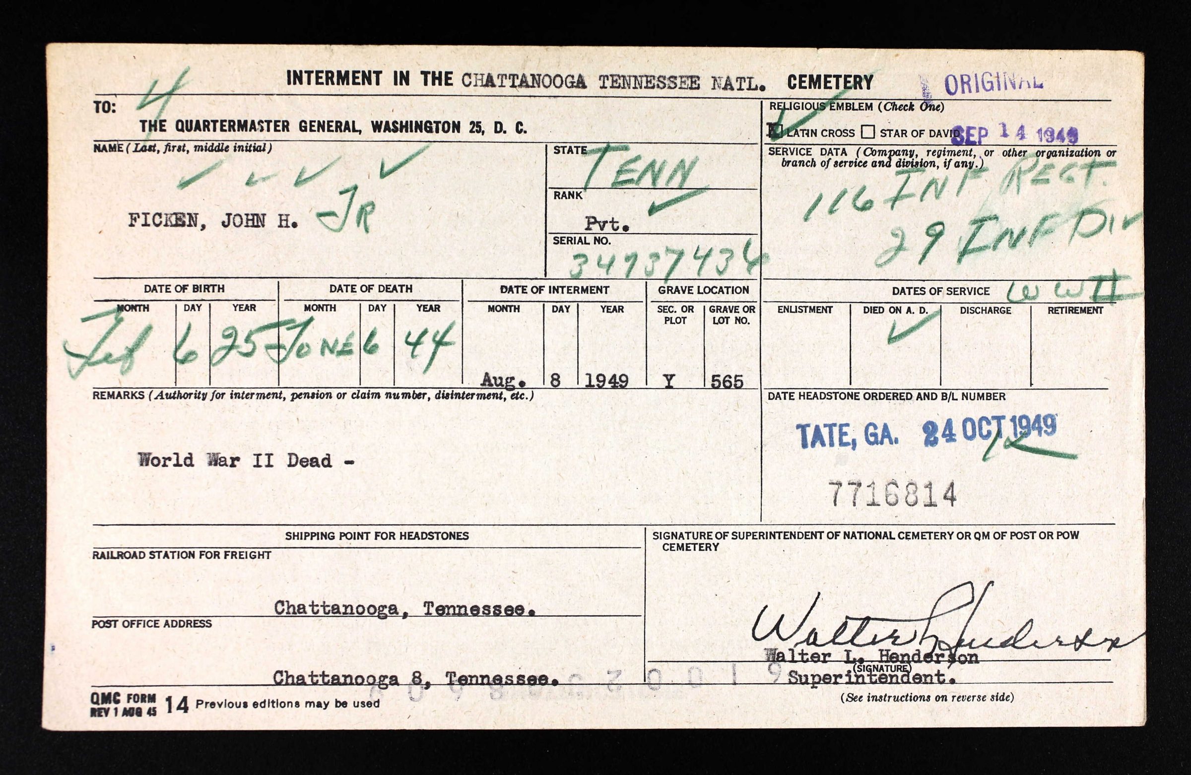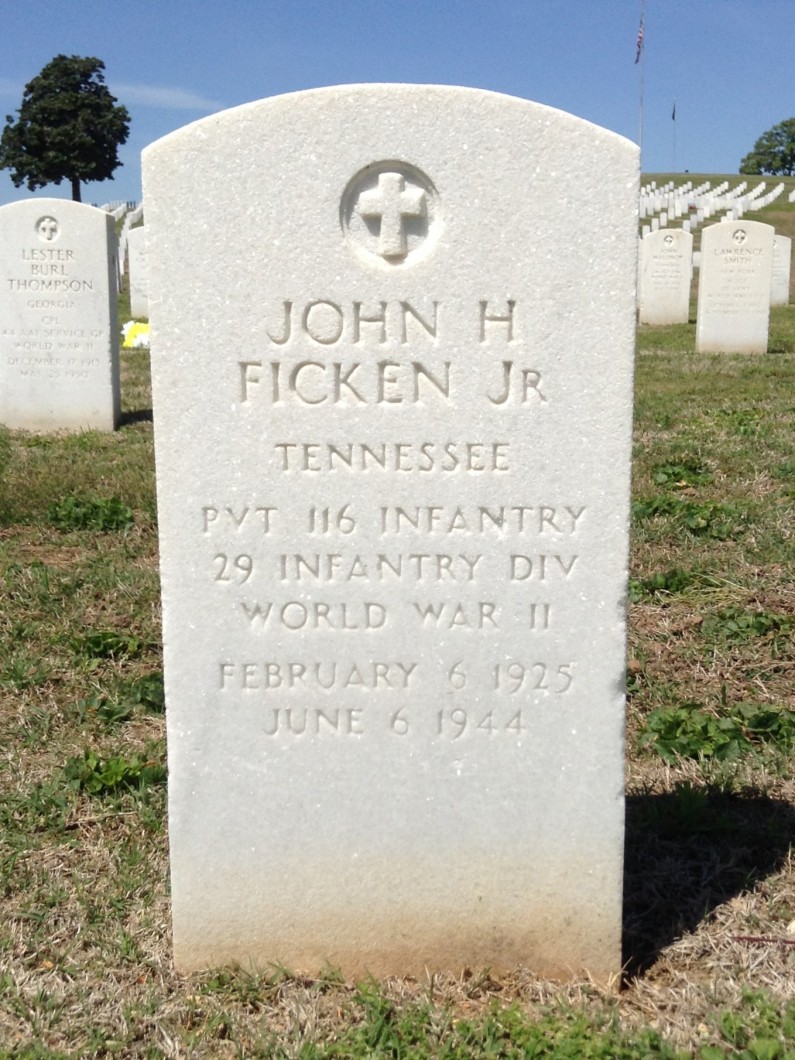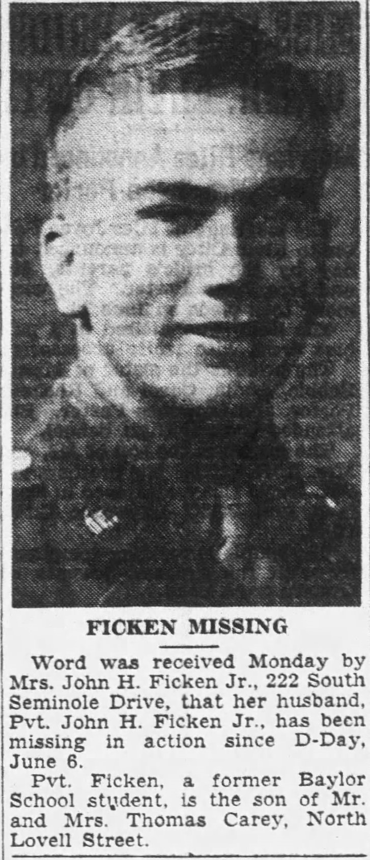 Pvt. John H. Ficken, Jr., 20, son of Mrs. F.M. Cary, 107 North Lovell Street and husband of Mrs. Frances Swope Ficken, 222 South Seminole Drive, who was previouslyreported missing in action with an infantry unit since D-Day, was listed killed in action on that date, according to official information received by the family. A student at Baylor School before entering the army in June, 1943, he went overseas in December of the same year. He is survived by his wife, parents and three sisters, Marjorie, Betty and Doris Ficken, all of Chattanooga.
