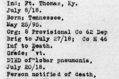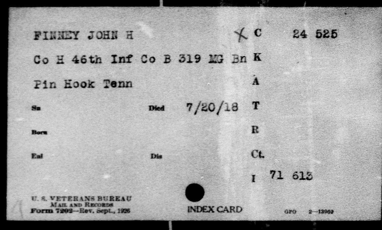 John H. Finney was born in 1895, husband of Laura Finney. He died of lobar pneumonia at the Base Hospital at Camp Sheridan, Montgomery, Alabama on July 20, 1918.