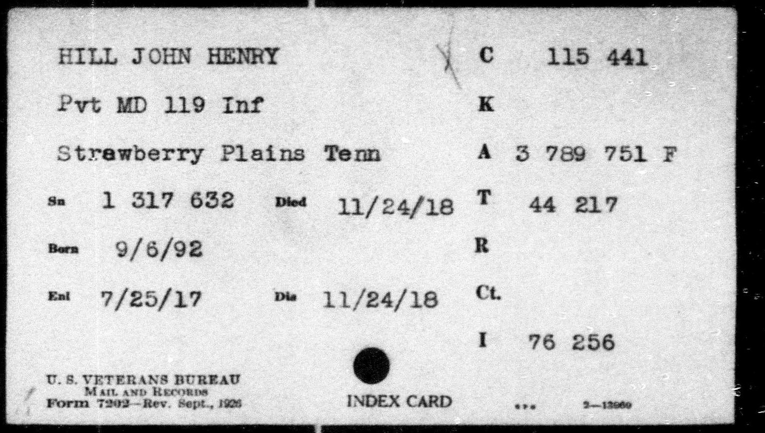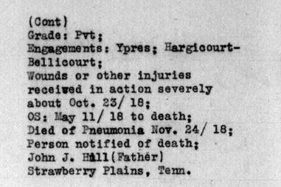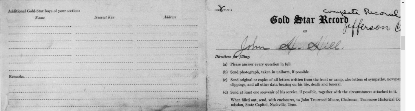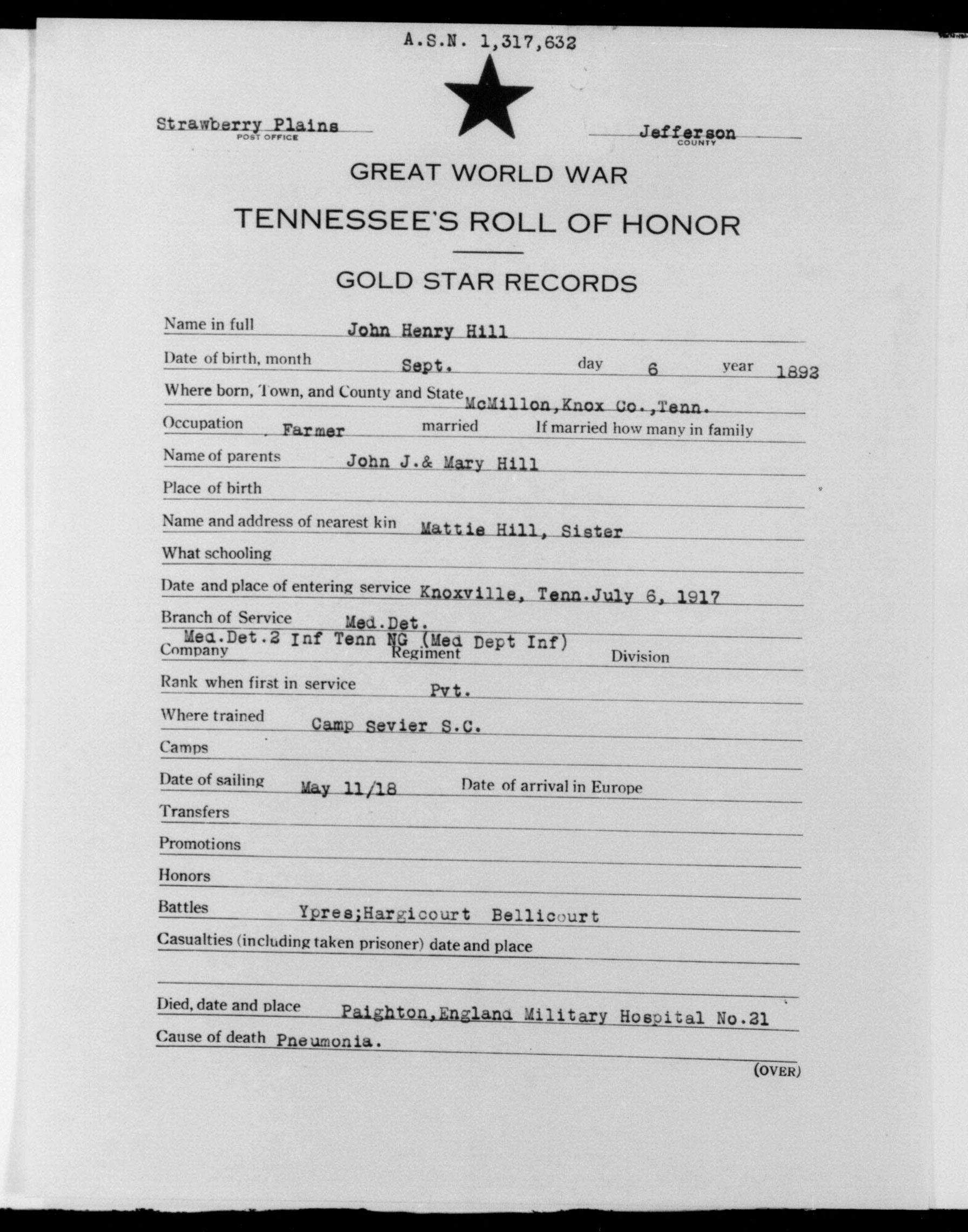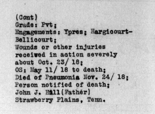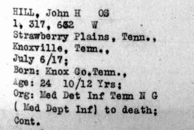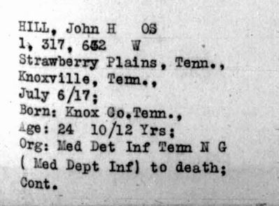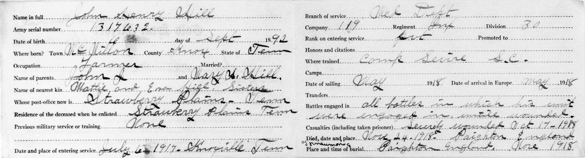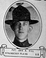 John Henry Hill was born September 6, 1892, son of John J. and Mary A. Hill. He was a farmer before entering service July 6, 1917 in Knoxville, TN. He received training at Camp Sevier, South Carolina and left for overseas duties on May 11, 1918. He died of pneumonia at the Military Hospital No. 21 at Paignton, England.