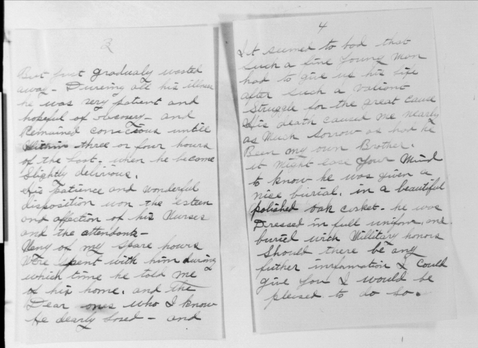 I should like to convey to you the deep sympathy of the Red Cross in your sad bereavement. The hospital in which Pvt. Hill died of wounds followed by pneumonia, is one of the best equipped in England, and he was tenderly cared for by a skillful staff of American surgeons and nurses. Everything that was humanly possible was done to save his life, and no one could have been better looked after. I was present at his funeral which was a military one. The casket was covered with the Stars and Stripes, and on it rested beautiful flowers sent by the Red Cross. It was borne to the Grave by American soldiers and after the service, the volleys were fired and the bugle sounded the “Last Post”. Your son lies in this beautiful Paignton cemetery, overlooking the English channel. His Grave is in one corner reserved for Americans, so he lies amongst his comrades.