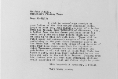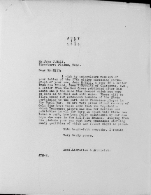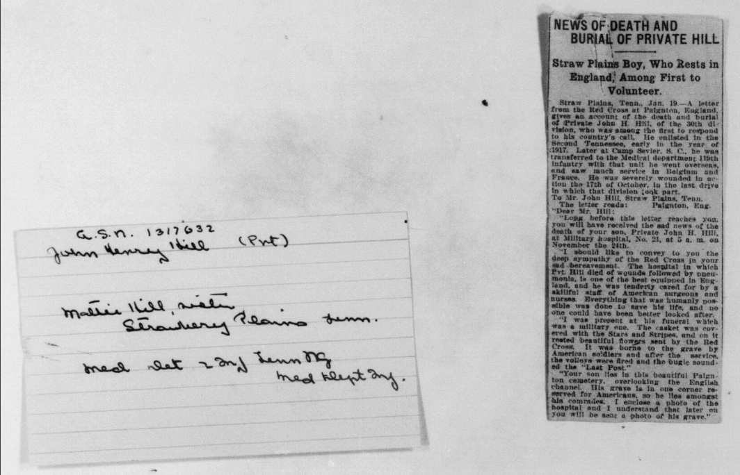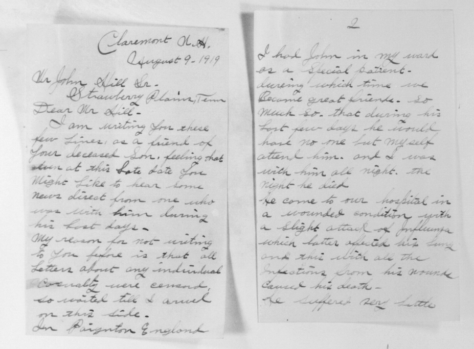A letter from the Red Cross at Paignton, England gives an account of the death and burial of Private John H. Hill, of the 30th Division, who was among the first to respond to his country’s call. He enlisted in the Second Tennessee, early in the year of 1917. Later at Camp Sevier, S.C., he was transferred to the medical department 119th infantry with that unit he went overseas, and saw much service in Belgium and France. He was severely wounded in action the 17th of October, in the last drive in which division took part.