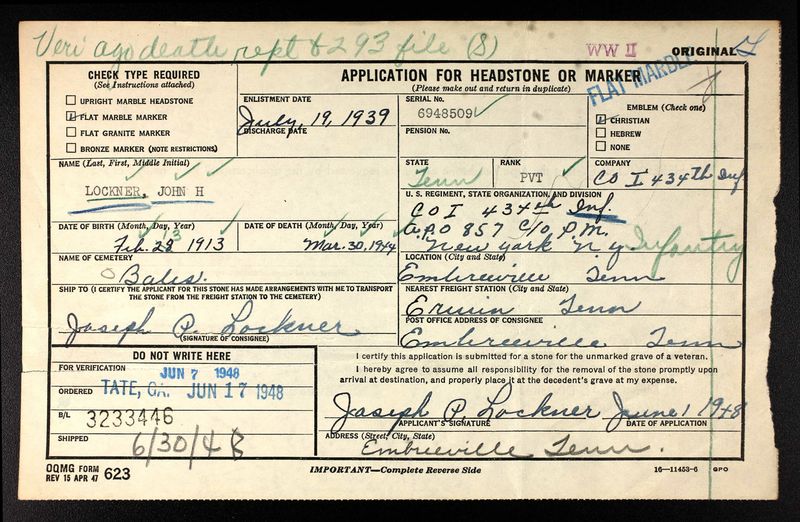John Howard Lockner was born on 13 February 1913 in Embreeville, TN, the son of Joseph Philip Lockner and Mary Tucker.