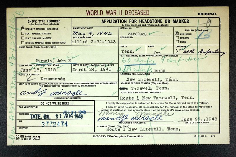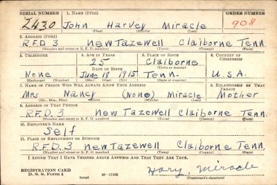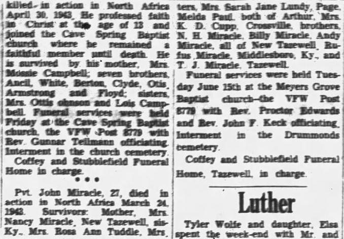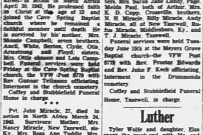 Pvt. John Miracle, 27, died in action in North Africa March 24, 1943. Survivors; mother, Mrs. Nancy Miracle, New Tazewell, sisters, Mrs. Rosa Ann Tuddle, Mrs. Sarah Jane Lundy, Melda Paul, both of Arthur, Mrs. K.D. Cupp, Crossville; brothers, N.H. Miracle, Billy Miracle, Andy Miracle, all of New Tazewell, Rufus Miracle, Middlesboro, Ky., and T.J. Miracle, Tazewell.