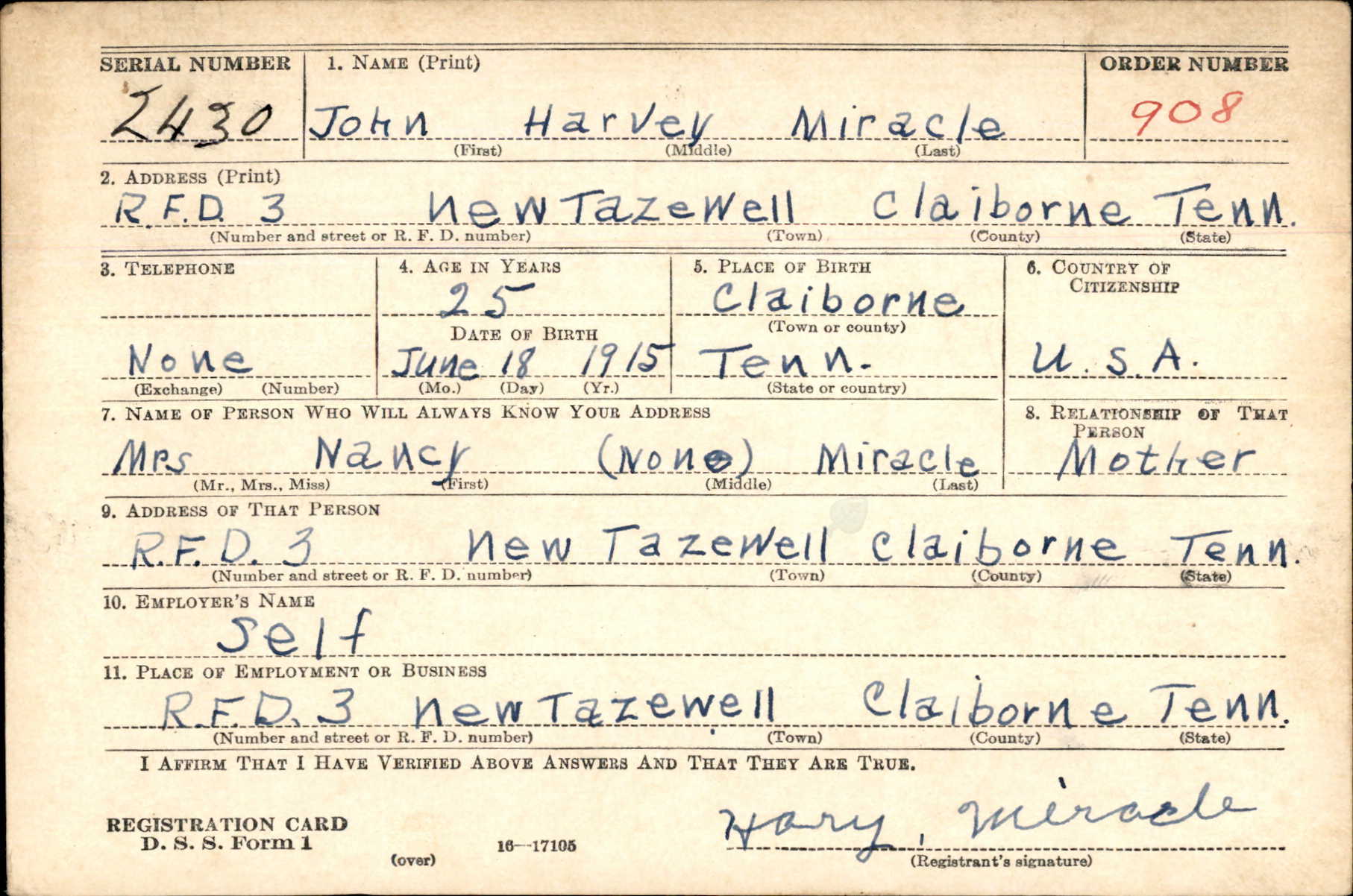 John Harvey Miracle was born on 18 June 1915, the son of Pleasant Awitt Miracle and Nancy Jane Cupp