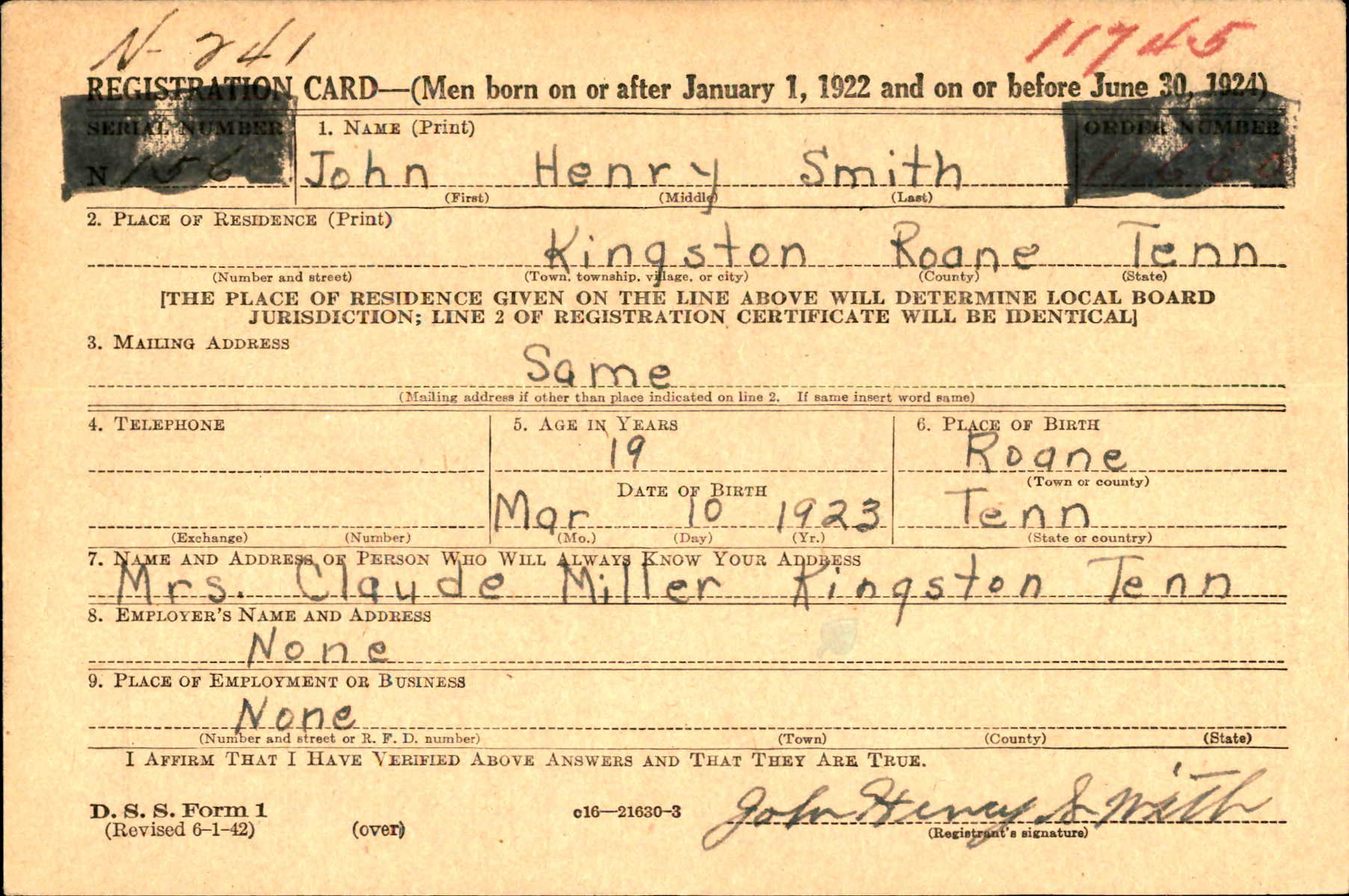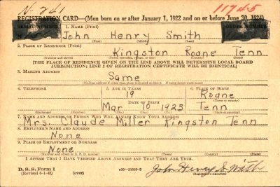 John Henry Smith was the son of John Everet Smith and Rose Etta Herrell. His mother remarried Claude F. Miller on 12 October 1936 and the family moved to a house in Kingston. John was interested in enrolling in the CCC camp but was not quite 17 and was rejected for that reason. He had been employed part time in the Legget’s Grocery Store. In December 1940 he had enrolled in the CCC Camp