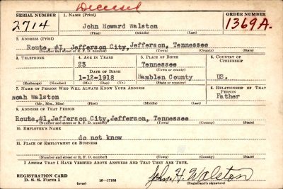 Pvt Walston is buried at Martha Sunderland Cemetery, Hamblen County, Tennessee.