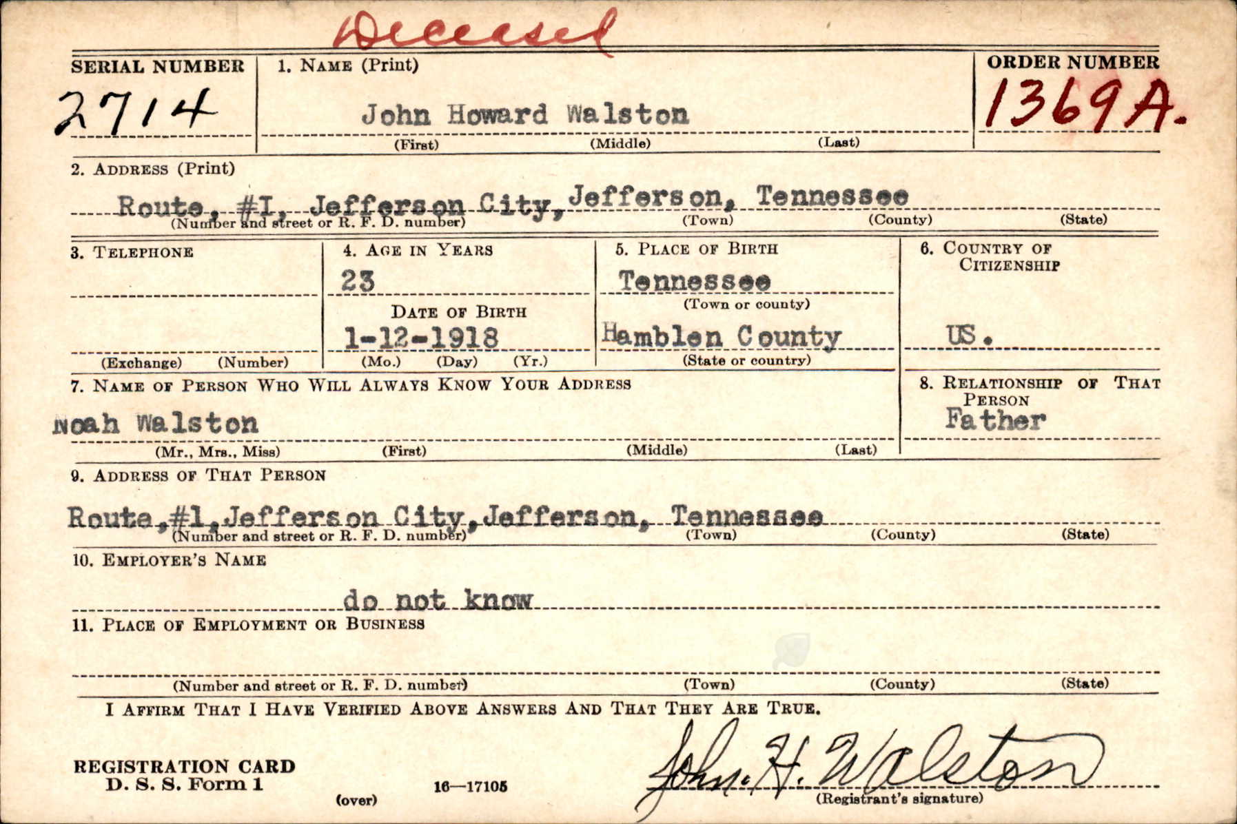 John Howard Walston was born on 12 January 1918, son of Noah Walston and Myrtle Hoskins.