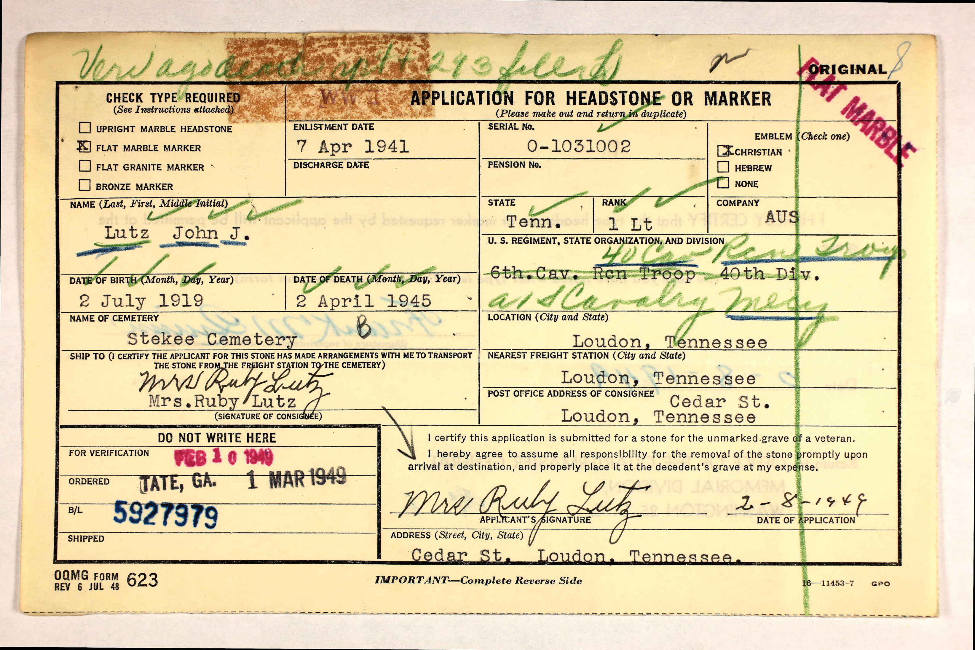 He was leading the First Platoon on a reconnaissance mission forward of our lines on April 2, 1945, when he was called upon to assist in the assault of a strong enemy position. Riding in an armored car at the head of his platoon at a very fast pace over rough terrain and under intense enemy fire, Lieutenant Lutz was fatally injured when his vehicle overturned and rolled into a steep ditch. This brave officer lived only a few minutes after the unfortunate accident, but we are certain he did not suffer greatly.